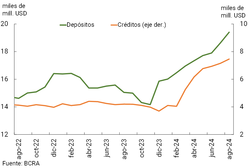 En agosto el saldo de depósitos en moneda extranjera del sector privado se incrementó 4,2% respecto al mes anterior —en moneda de origen—, desempeño explicado mayormente por el ingreso de fondos al sistema financiero en el marco del Régimen de Regularización de Activos establecido por la Ley 27.743 y su reglamentación. El aumento del saldo real de los depósitos totales del sector privado resultó casi compensando por una caída de los depósitos del sector público, haciendo que el saldo real total de los depósitos (todos los sectores y moneda) se mantenga sin cambios significativos en el mes (0,2% real)9.