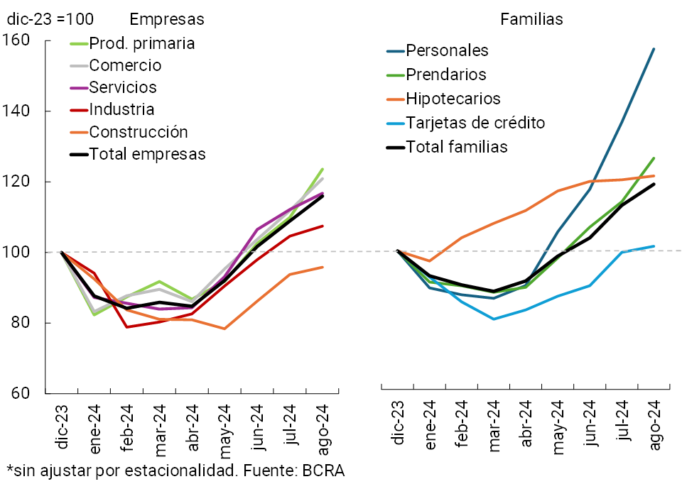 • El saldo real de financiamiento al sector privado en pesos se incrementó 6,5% en agosto —con aumentos en todos los segmentos crediticios y grupos de entidades financieras—, acumulando una expansión de 39,3% desde fines de abril. El saldo de financiaciones en moneda extranjera también creció en el mes (4,3% en moneda de origen). Así, el saldo real de crédito total al sector privado (en moneda nacional y extranjera) acumuló un incremento de 5,9% en agosto, reflejándose tanto en los préstamos a las empresas (6,5% real) como a las familias (5,4% real).