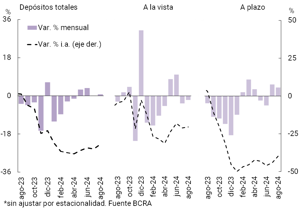9 En agosto el saldo de los depósitos totales (todas las monedas y sectores) acumuló una caída de 23,9% i.a. real.
