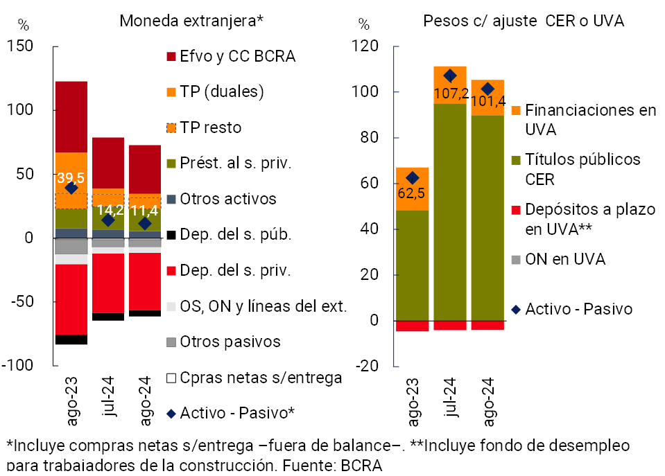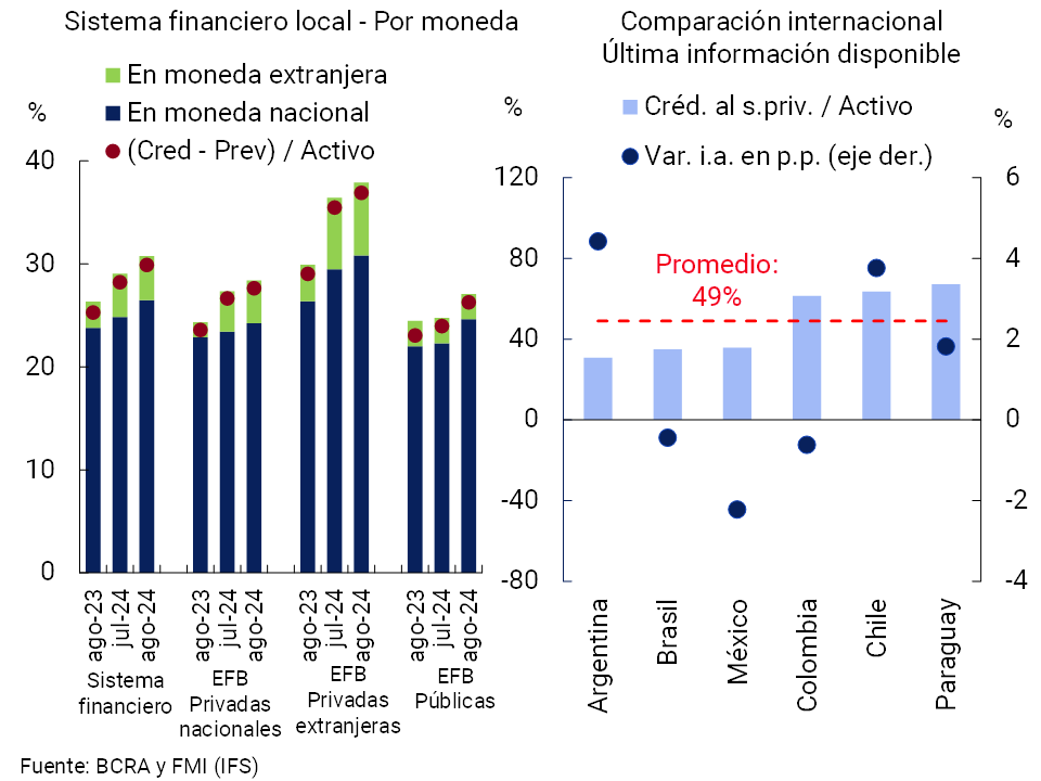 Al diferenciar por monedas, la exposición en pesos del sistema financiero al sector privado alcanzó 26,5% en agosto, 1,6 p.p. más que en julio (+2,7 p.p. i.a.). Por su parte, la participación del crédito en moneda extranjera se ubicó en 4,3% del activo, manteniéndose sin variaciones de magnitud respecto al mes pasado (+0,1 p.p. mensual y +1,7 p.p. i.a.) Al deducir el saldo de previsiones, en agosto el financiamiento al sector privado totalizó 29,9% del activo (+1,7 p.p. en el mes p.p. y +4,6 p.p. i.a.).