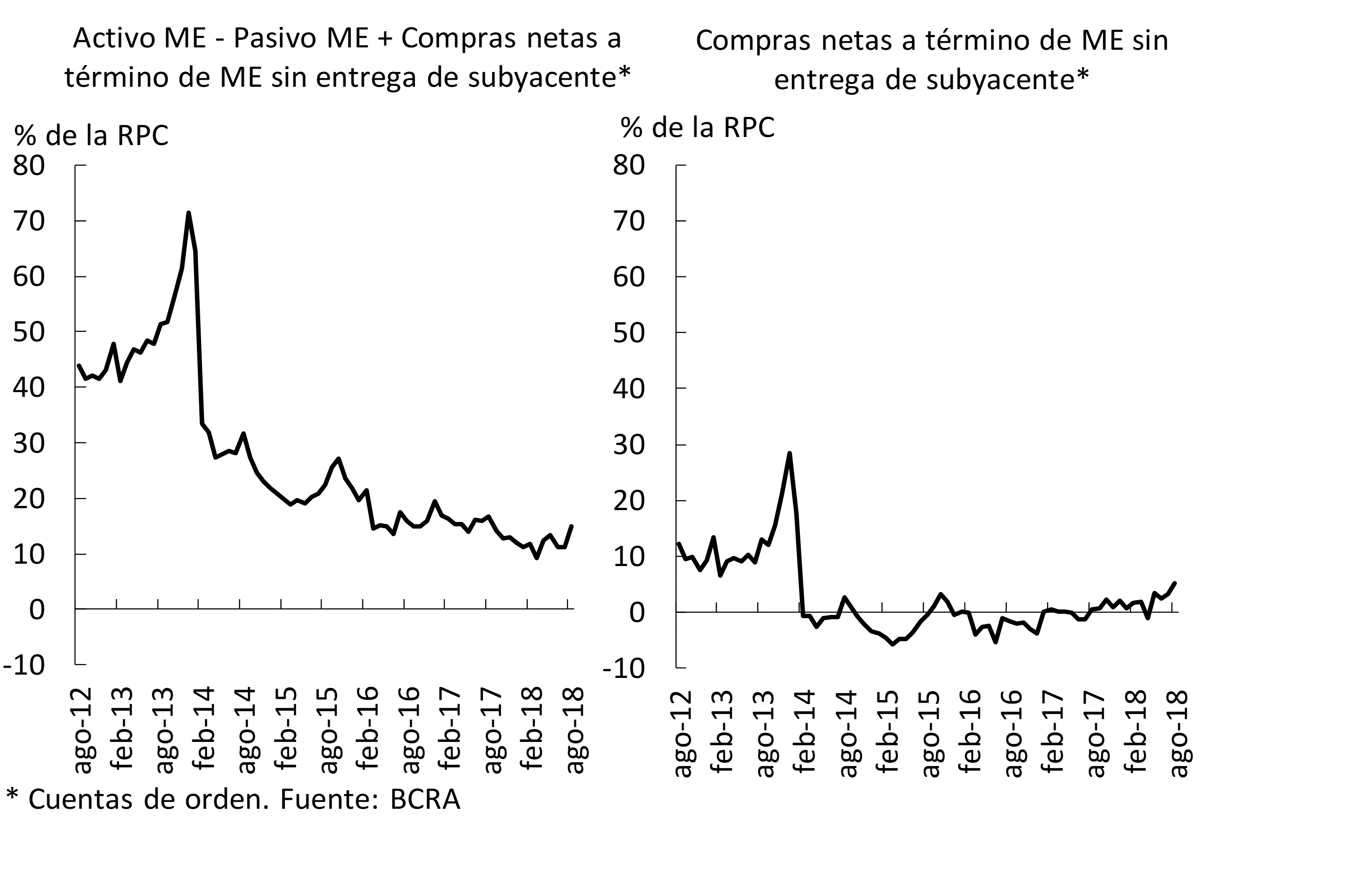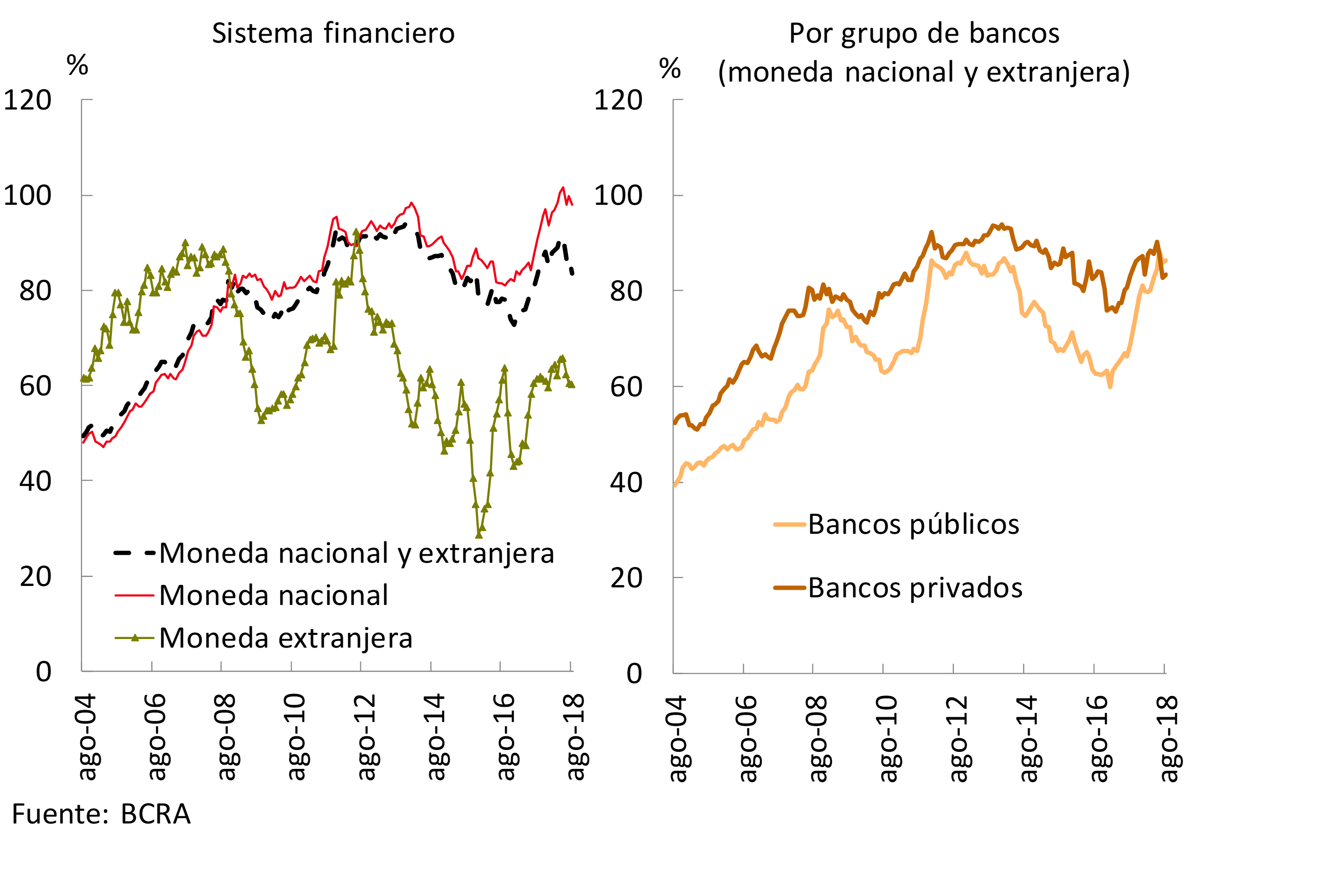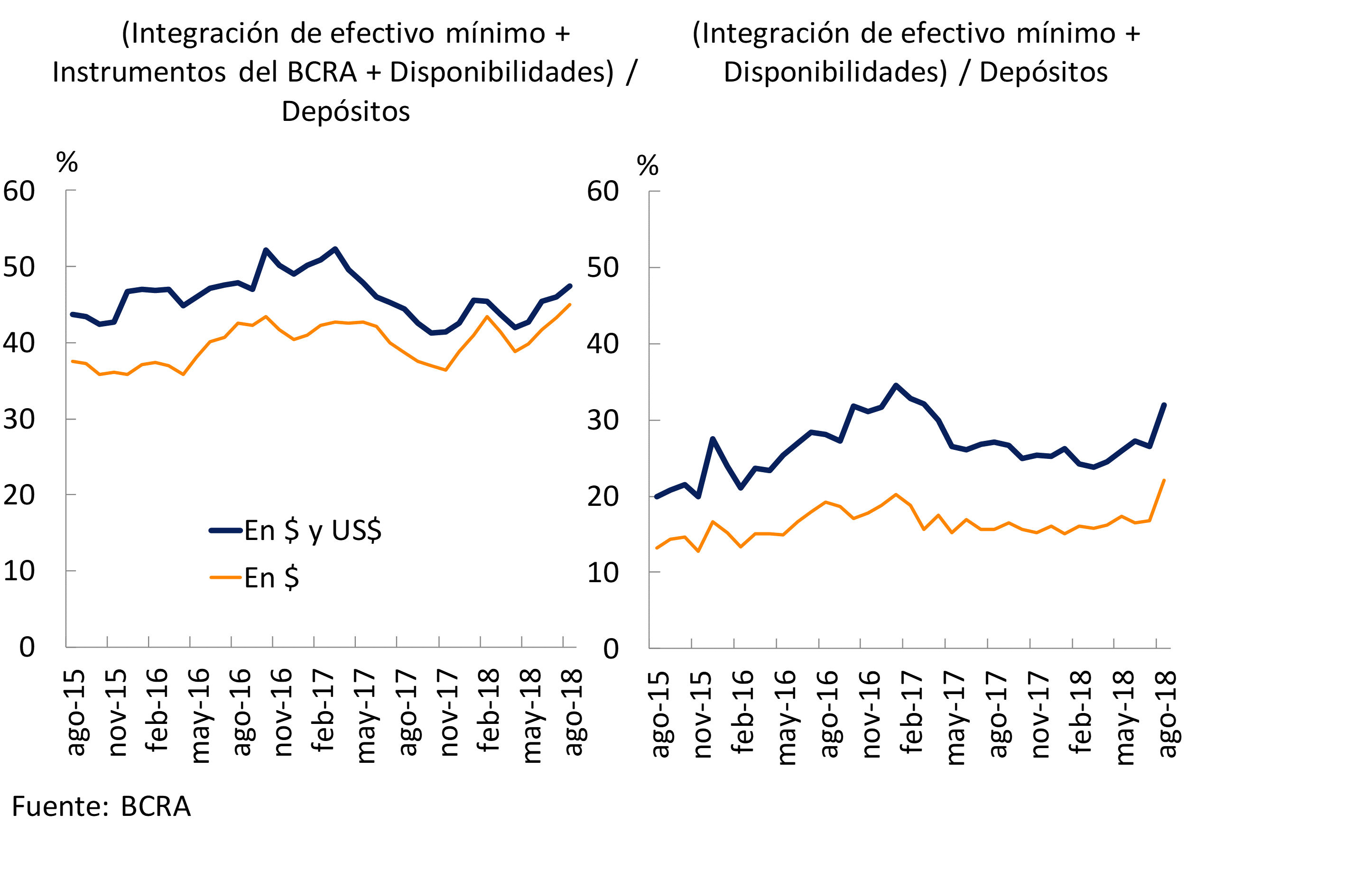• El indicador amplio de liquidez para el sistema financiero —integración de efectivo mínimo, instrumentos del BCRA y otras disponibilidades— representó 47,4% de los depósitos totales (45% en partidas en pesos) en el mes, aumentando 1,4 p.p. (1,7 p.p.) con respecto a julio. La liquidez en sentido más estricto —integración de efectivo mínimo y otras disponibilidades— se ubicó en 31,9% de los depósitos en agosto, incrementándose 5,4 p.p. Este desempeño mensual de los ratios de liquidez se dio en el marco de la entrada en vigencia de la suba de encajes de 3 p.p. para los depósitos en pesos dispuesto oportunamente para aquellas entidades financieras comprendidas en el grupo “A”. Tal aumento en la exigencia debe ser integrado en su totalidad con recursos en las cuentas corrientes, aumentando la importancia relativa de estas últimas entre los activos líquidos. Considerando sólo las partidas en moneda extranjera, el ratio de liquidez representó 52,4% de los depósitos en dicha denominación.