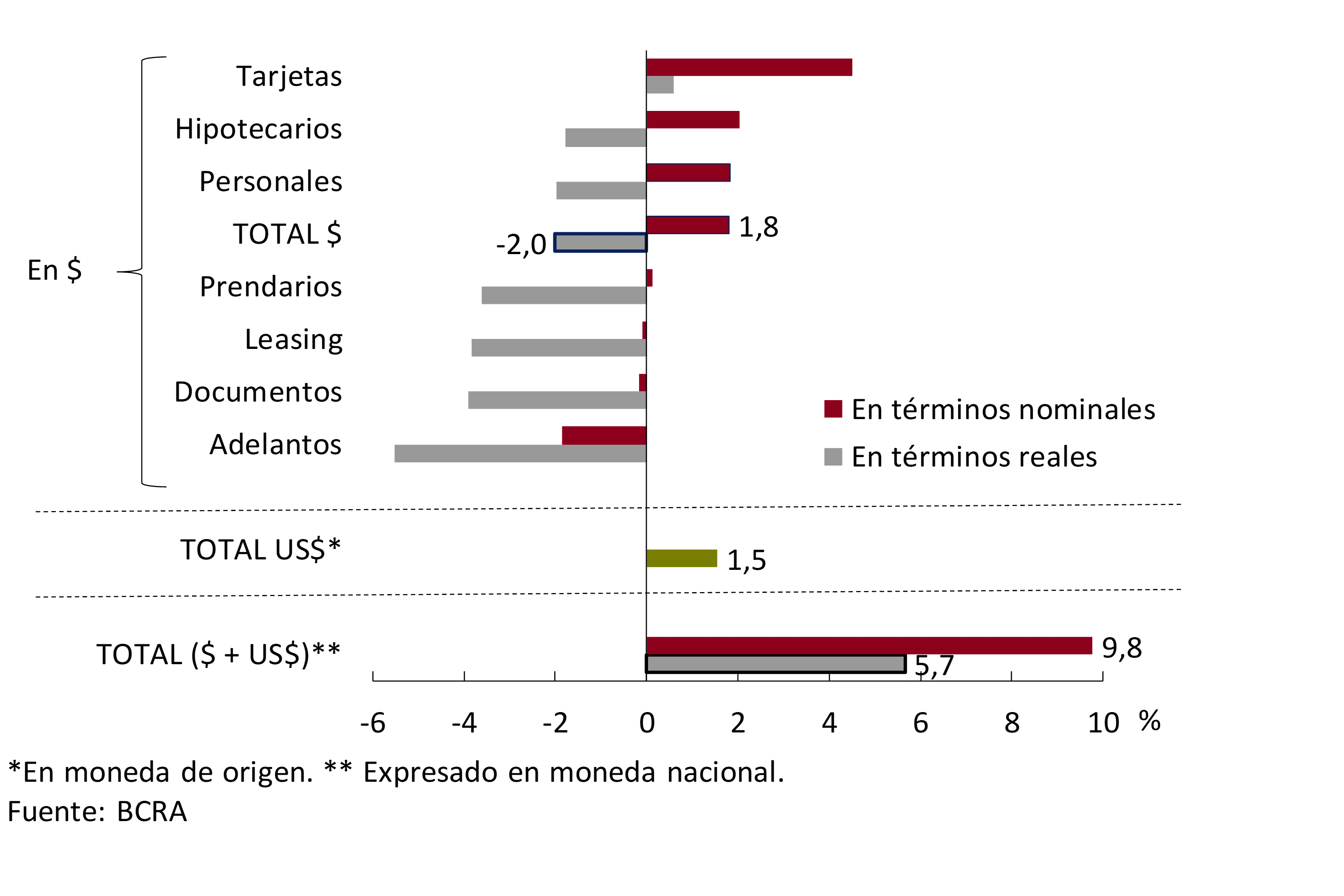 Crédito al sector privado: préstamos al sector privado no financiero incluyendo intereses devengados y ajuste CER y CVS y leasing.