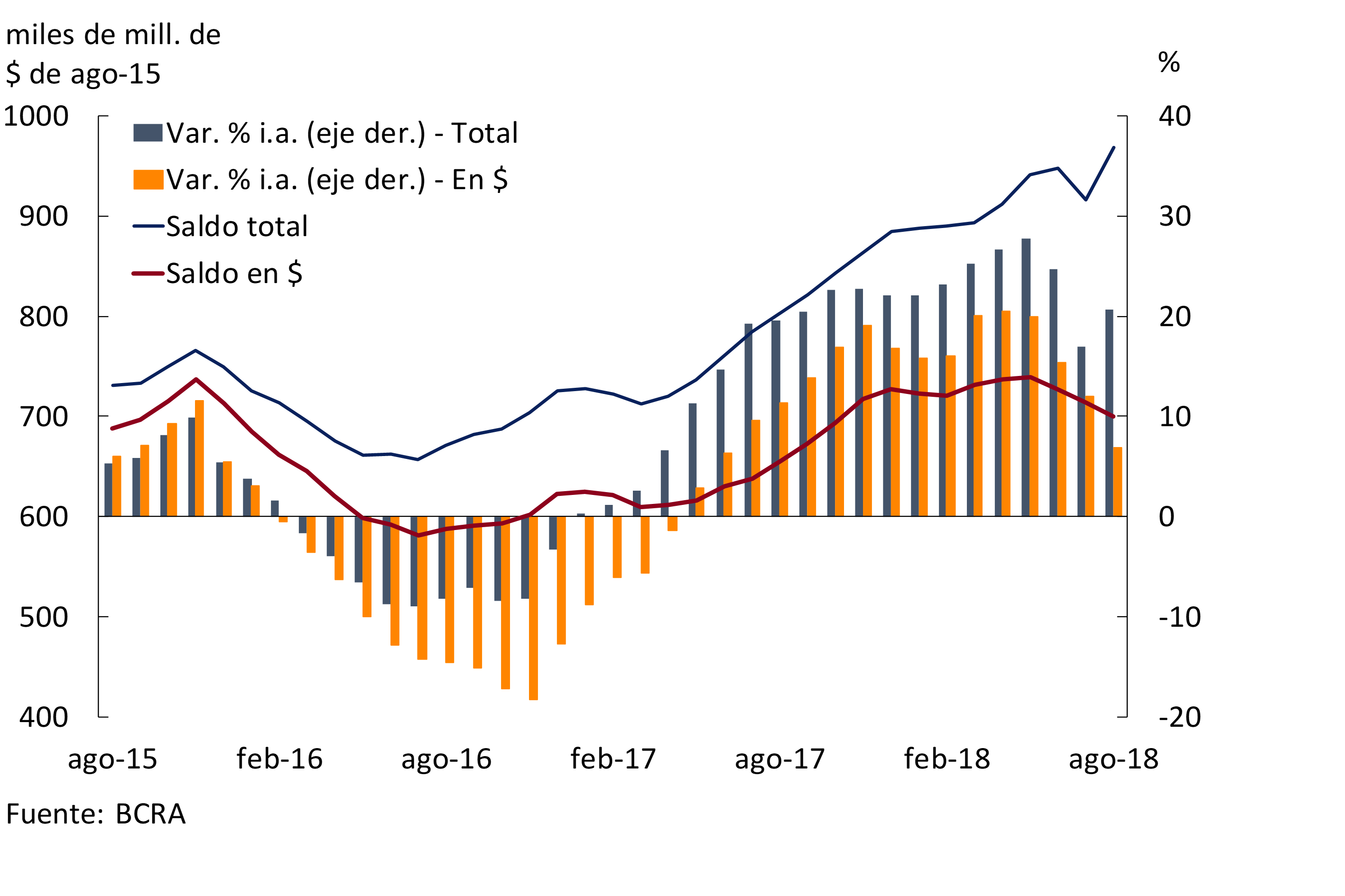 • Los depósitos totales en moneda nacional aumentaron 1,7% en términos reales en agosto (+5,6% nominal), impulsados por las colocaciones del sector público. Los depósitos del sector privado en pesos no presentaron cambios de magnitud en el mes al ajustar por inflación (+3,8% nominal), con una caída en las colocaciones a plazo prácticamente compensada por el aumento en los saldos a la vista. Los depósitos totales en moneda extranjera se incrementaron 2,1% en el mes —en moneda de origen—. En una comparación interanual el saldo de depósitos totales en pesos creció 13,9% en términos reales, conducido por las cuentas del sector público. Los depósitos del sector privado en pesos se redujeron levemente en los últimos doce meses, ajustando por inflación. Las imposiciones totales en moneda extranjera se incrementaron 2,2% i.a., dinámica mayormente explicada por las cuentas del sector privado.