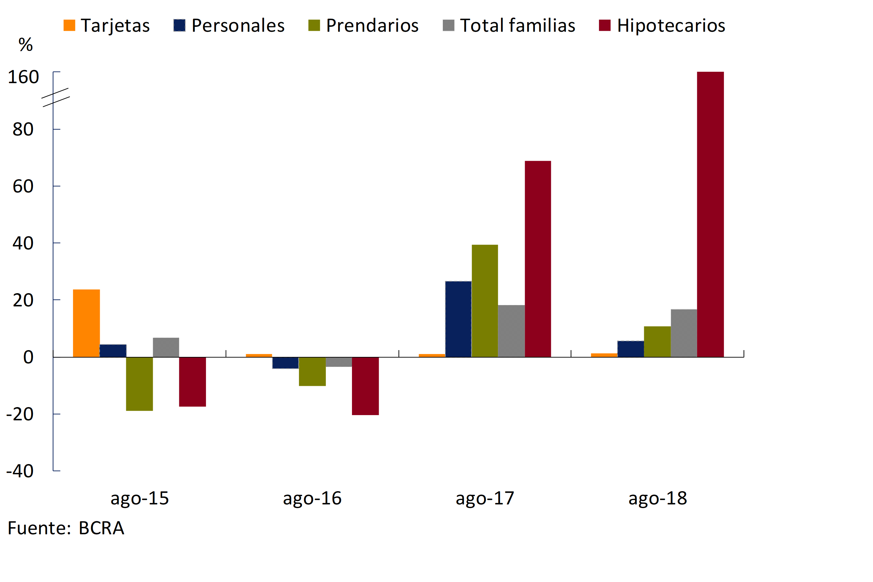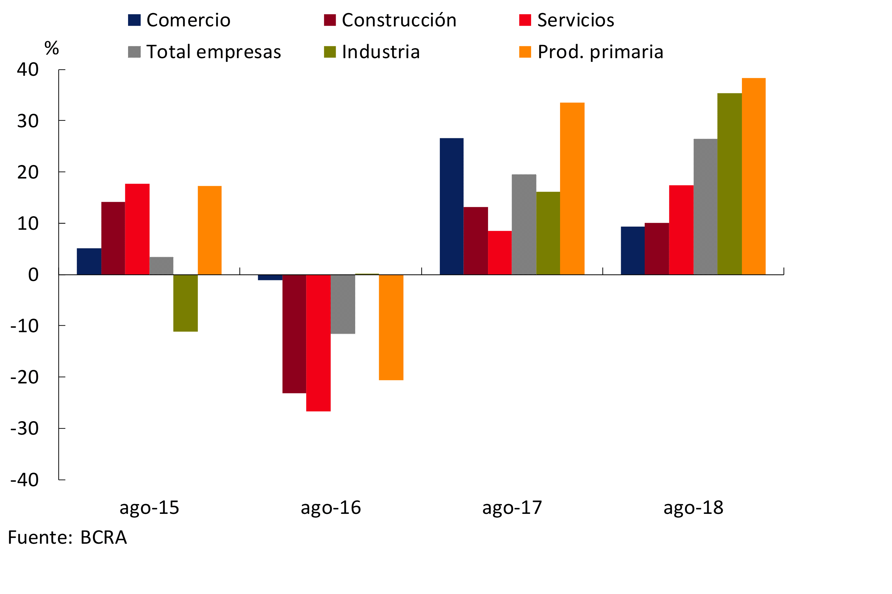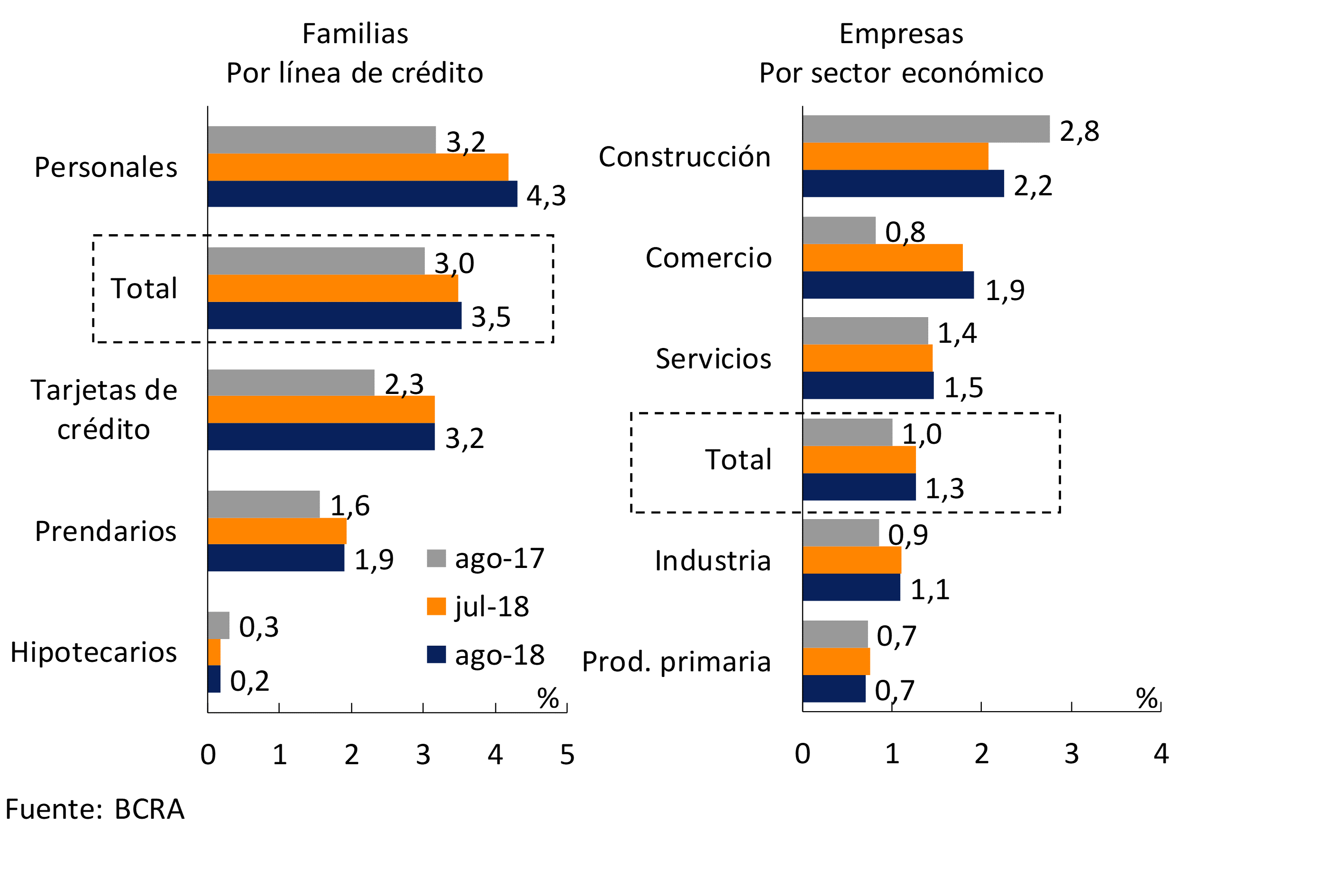 17 Información extraída de la Central de Deudores (comprende tanto moneda nacional como extranjera). No se incluyen los créditos a residentes en el exterior. Las financiaciones a empresas se definen aquí como aquellas otorgadas a personas jurídicas y el financiamiento comercial otorgado a individuos. Por su parte, se considera préstamos a familias a aquellos otorgados a individuos, excepto que tengan destino comercial.