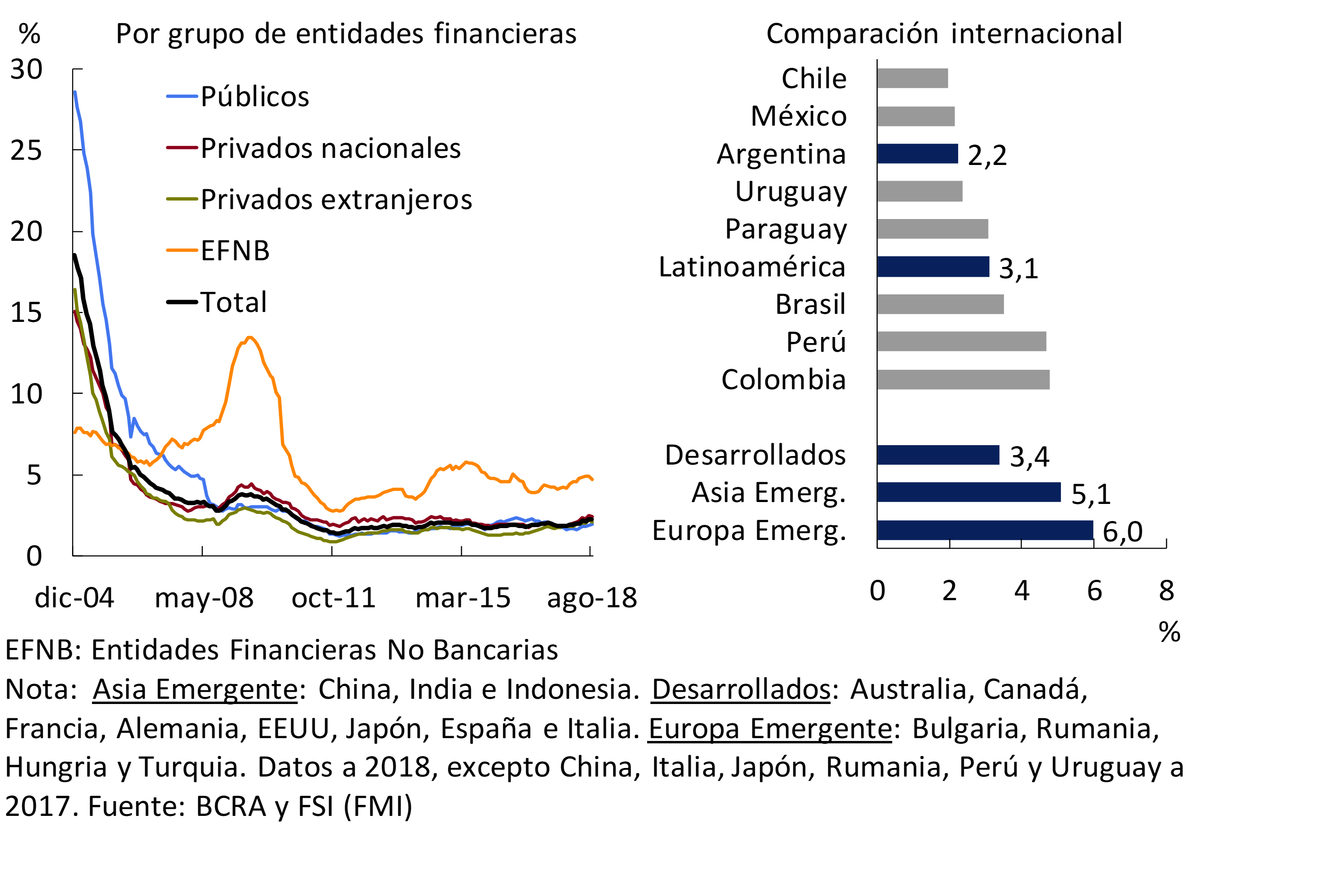 • El ratio de morosidad del crédito al sector privado se ubicó en 2,2% en agosto, permaneciendo sin cambios de magnitud respecto al registro del mes pasado (+0,3 p.p. i.a.). Este nivel se mantiene relativamente bajo tanto en la comparación histórica como en relación a los países de la región. La irregularidad de las financiaciones a las familias y a las empresas se mantuvo en niveles similares a los de julio (3,5% y 1,3% del total de cada cartera, respectivamente). Entre las líneas de financiamiento a los hogares, el coeficiente de morosidad de los hipotecarios se ubicó en 0,2% en el mes y en 0,11% para el subconjunto de hipotecarios en UVA. Las previsiones contables del sistema financiero representaron 124% de la cartera en situación irregular del sector privado. Cabe considerar que el ratio de rechazo de cheques por falta de fondos en relación al total compensado cayó nuevamente en septiembre —última información disponible—, hasta un nivel de 1,1% en términos de montos.