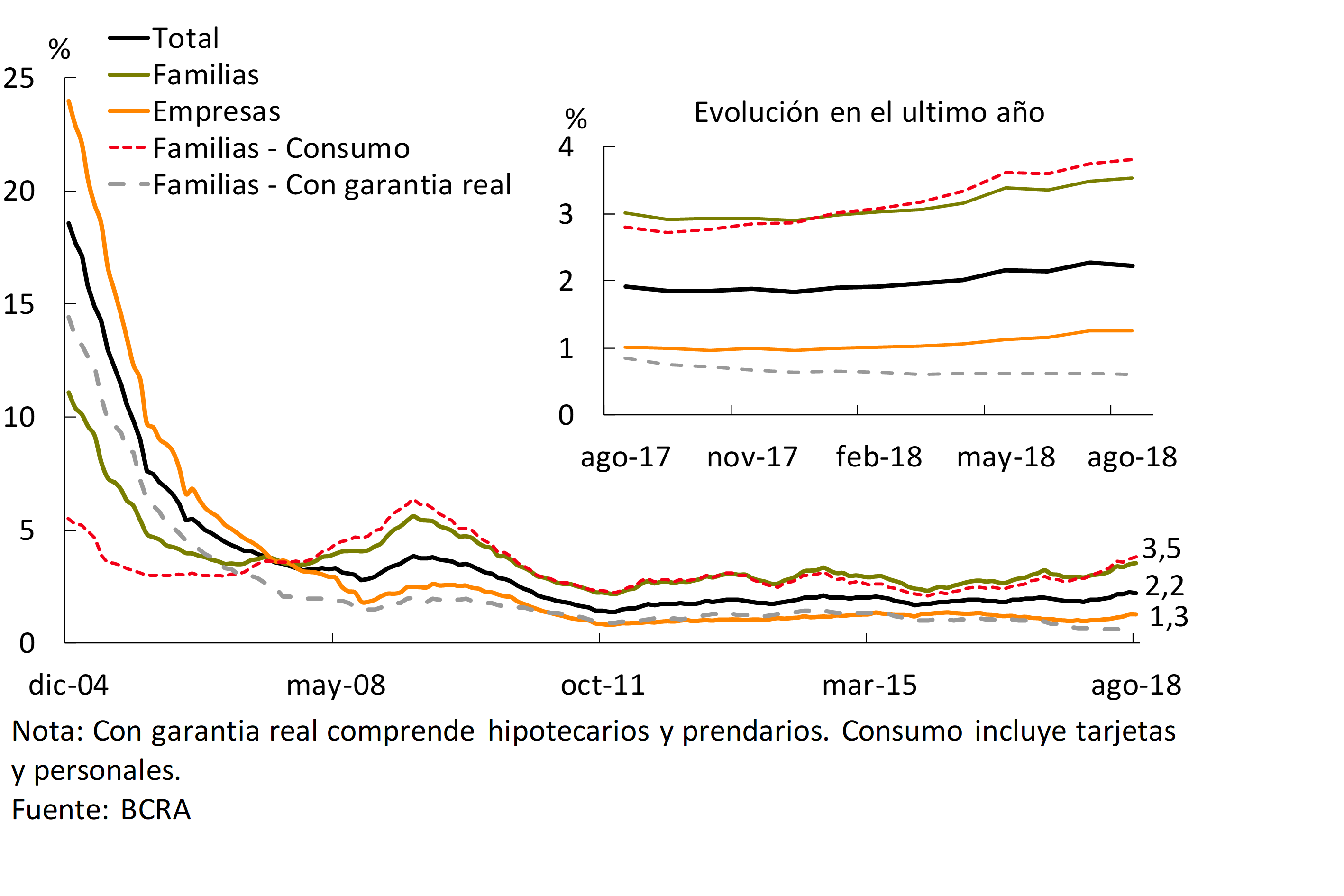 El ratio de irregularidad de los préstamos a las familias se ubicó en 3,5% en agosto (ver Gráfico 16). En los últimos doce meses este indicador acumuló un incremento de 0,5 p.p., debido en mayor medida al desempeño de los préstamos personales y de las tarjetas (ver Gráfico 17). Por su parte, el coeficiente de morosidad de las líneas hipotecarias se redujo levemente con respecto al nivel de agosto de 2017, hasta ubicarse en 0,2%21, y en sólo 0,11% para el subconjunto en UVA.