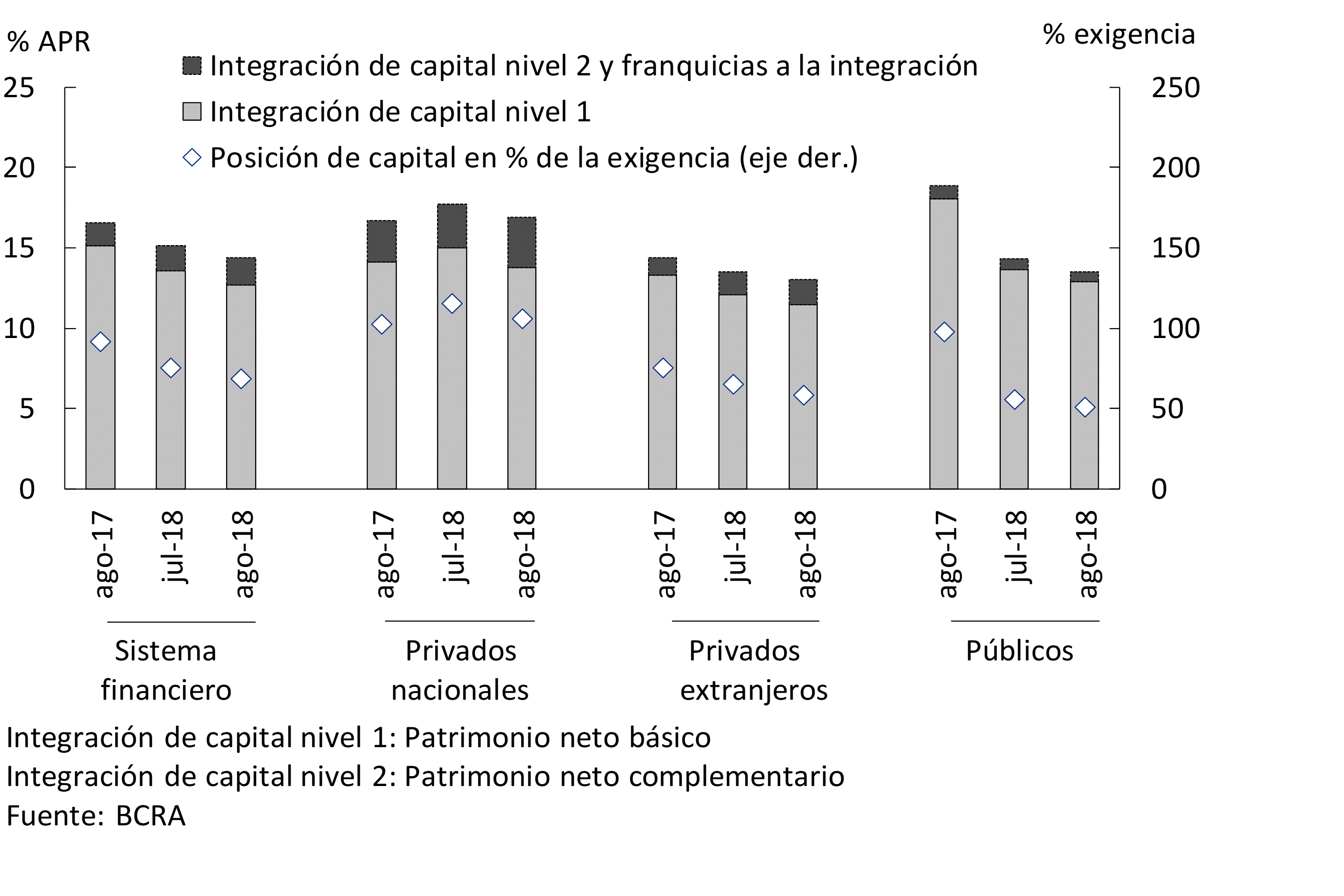 • En agosto los indicadores de solvencia del sistema financiero se mantuvieron en un rango de valores elevados. La integración de capital para el conjunto de bancos se ubicó en 14,4% de los activos ponderados por riesgo (APR) en el mes. El capital de Nivel 1 representó 12,7% de los APR. Por su parte, el exceso agregado de integración de capital alcanzó 69% de la exigencia normativa. Todos los grupos de entidades mantuvieron posiciones excedentarias de capital en relación al requisito mínimo prudencial.
