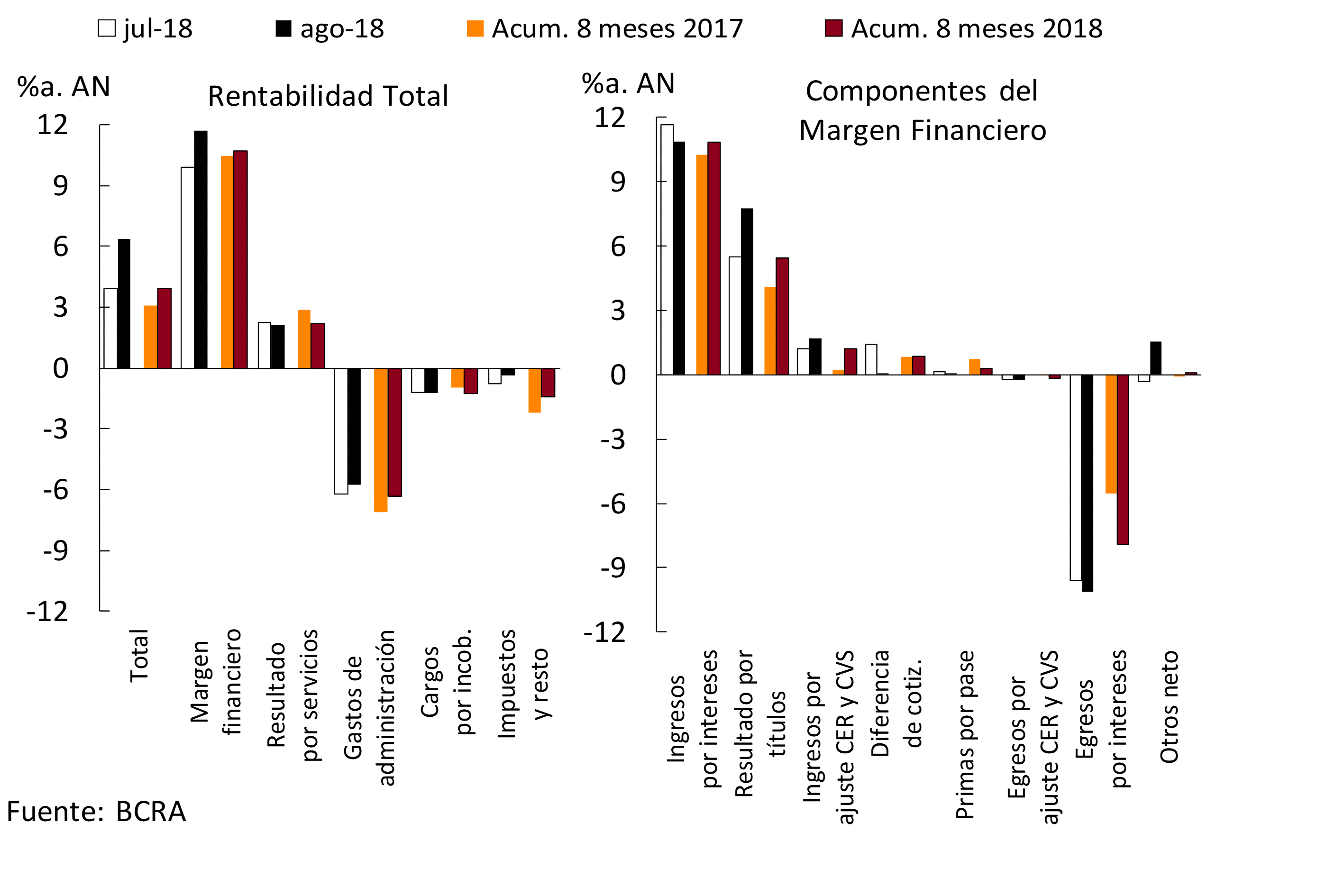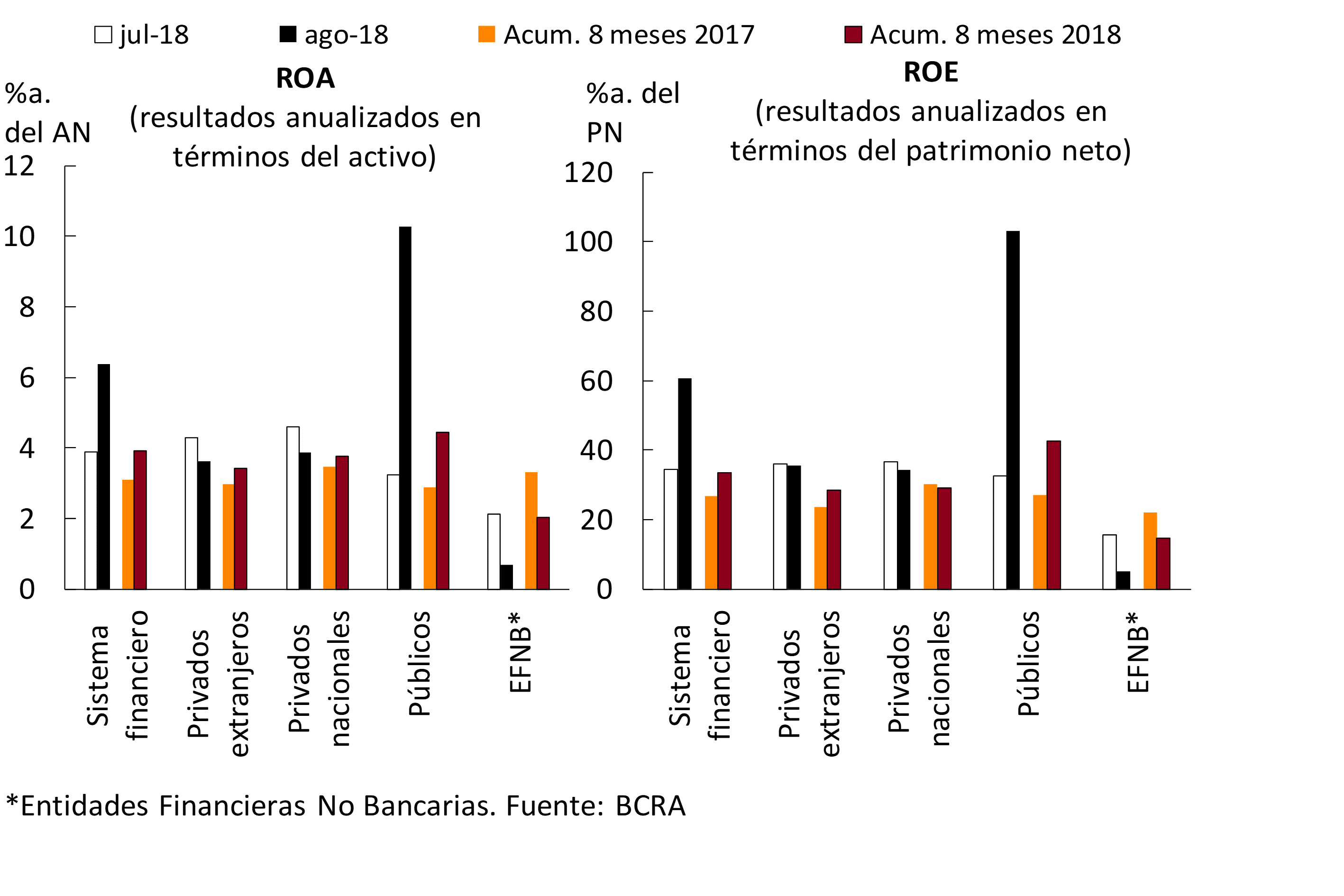 • En el mes las ganancias contables anualizadas (a.) del sistema financiero fueron equivalentes a 6,4% del activo, aumentando con respecto a julio. Por su parte, los bancos privados obtuvieron beneficios mensuales por 3,8%a. del activo (-0,7 p.p. con respecto a julio). Considerando el acumulado en ocho meses de 2018, los resultados devengados por el conjunto de entidades financieras representaron 3,9%a. del activo (33,6%a. del patrimonio neto), aumentando 0,8 p.p. en una comparación interanual (+6,8 p.p. i.a.). El grupo de bancos privados devengó ganancias por 3,6% a. del activo en lo que va de 2018, aumentando 0,4 p.p. i.a.