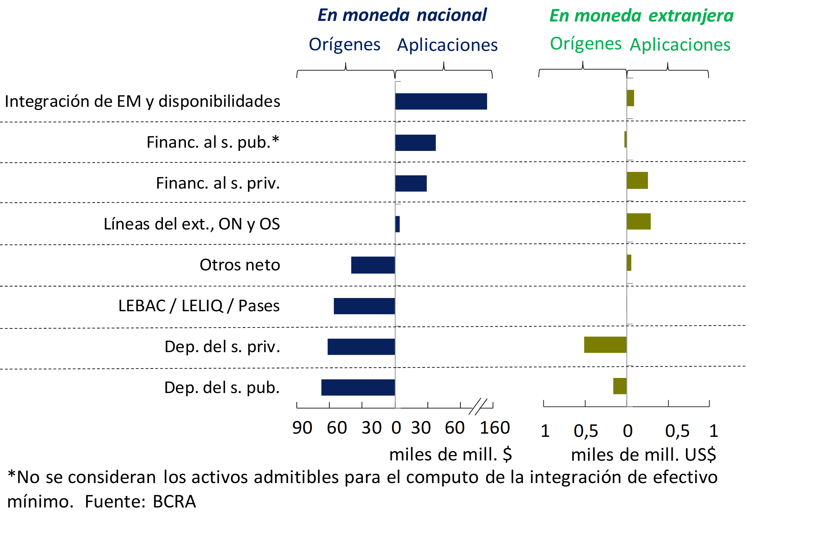 Activos líquidos: disponibilidades (integración de “efectivo mínimo” en cuenta corriente en el BCRA y en cuentas especiales de garantía y otros conceptos, fundamentalmente efectivo en bancos y corresponsalías) más el saldo acreedor neto por operaciones de pases de las entidades financieras contra el BCRA utilizando LEBAC y NOBAC.