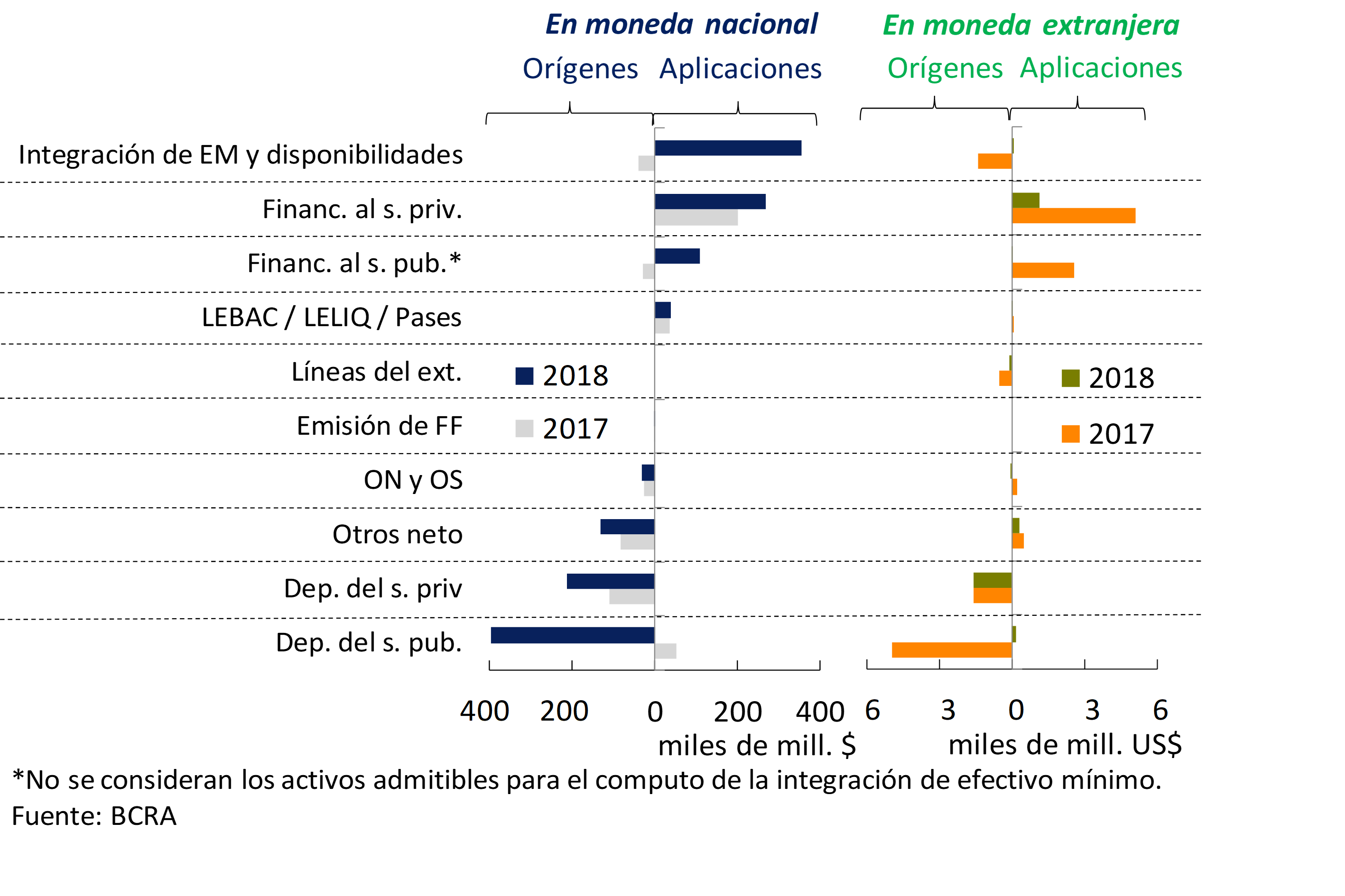 Considerando el flujo de fondos del sistema financiero para el acumulado de ocho meses de 2018, la expansión de los depósitos del sector público ($398.000 millones) y del sector privado ($212.000 millones) fueron los orígenes en moneda nacional más destacados (ver Gráfico 3). Estos recursos se canalizaron mayormente a incrementar la integración de efectivo mínimo en pesos ($356.000 millones) y el financiamiento a las empresas y familias en igual denominación ($270.000 millones). En cuanto los rubros en moneda extranjera, en lo que va del año predominó la intermediación financiera con el sector privado. El aumento de los depósitos y de los préstamos resultaron la fuente y destino de fondos más relevantes, respectivamente.