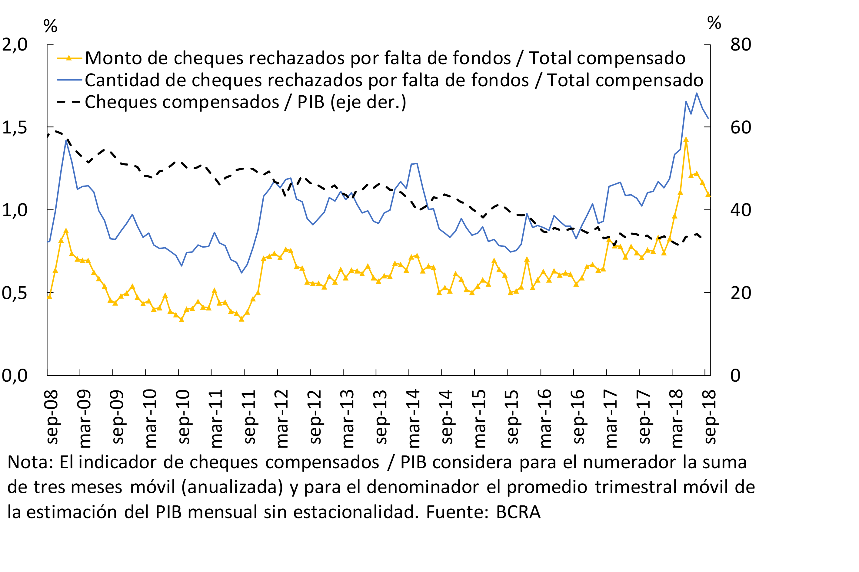 Considerando las operaciones cursadas por el Sistema Nacional de Pagos, en septiembre —última información disponible— se redujo la compensación de cheques, tanto en valores como en cantidad de documentos cursados. A septiembre los cheques compensados por cámara representaron 32,8% del PIB, 1 p.p. y 26 p.p. por debajo de lo evidenciado en septiembre de 2017 y del nivel de hace 10 años, respectivamente. En este marco, en el cierre del tercer trimestre del año se redujo el rechazo de cheques por falta de fondos en términos del total compensado —tanto en monto como en cantidad— (ver Gráfico 5). En particular, en términos de montos, el ratio de rechazo de cheques descendió hasta 1,1% del total compensado, continuando el descenso observado tras el pico de mayo de 2018 (cuando había alcanzado un nivel de 1,4%).