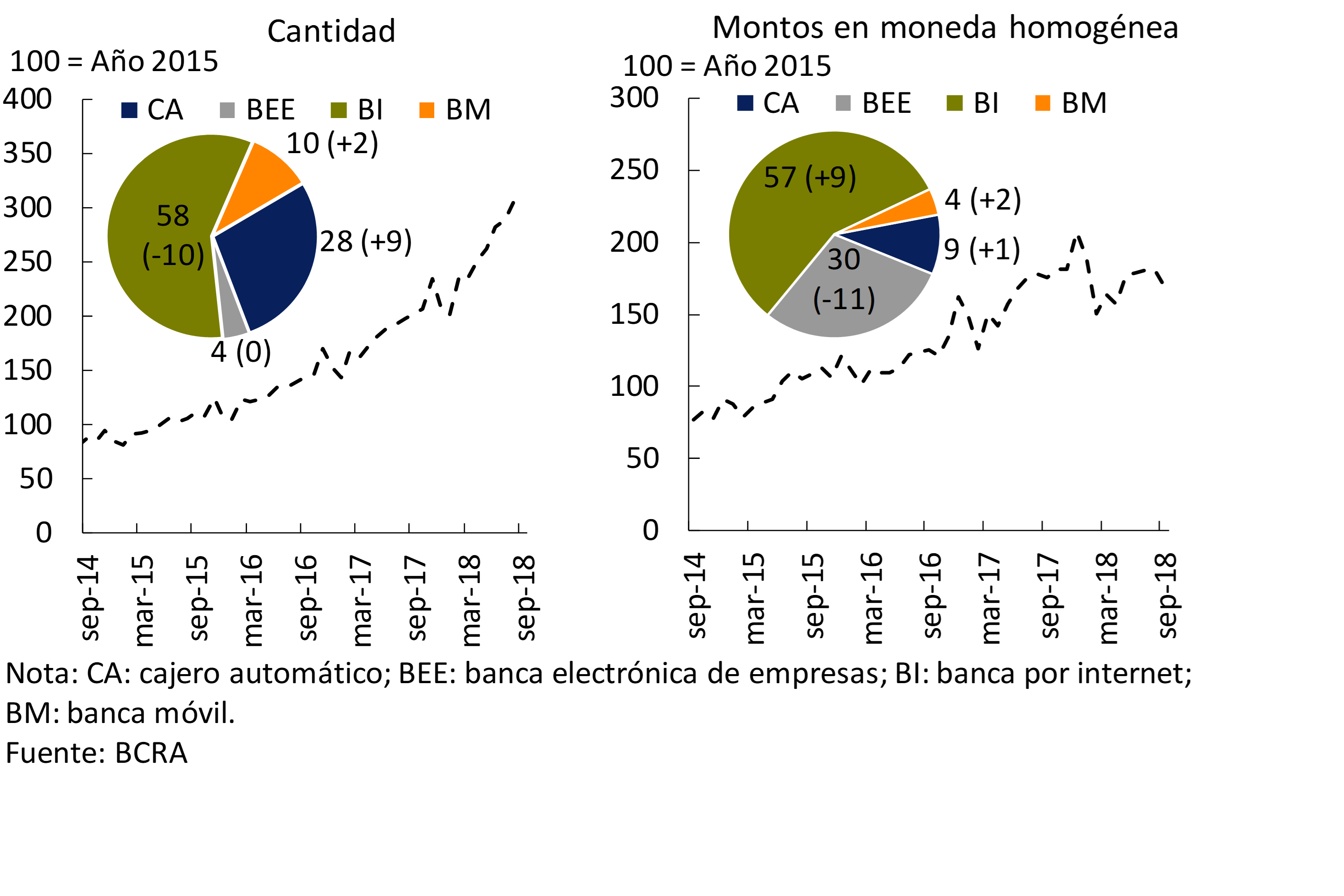 Gráfico 6 | Transferencias Inmediatas de Fondos por Canal – Evolución del total y participación % por canal a sep-18 (entre parén-tesis cambio interanual)