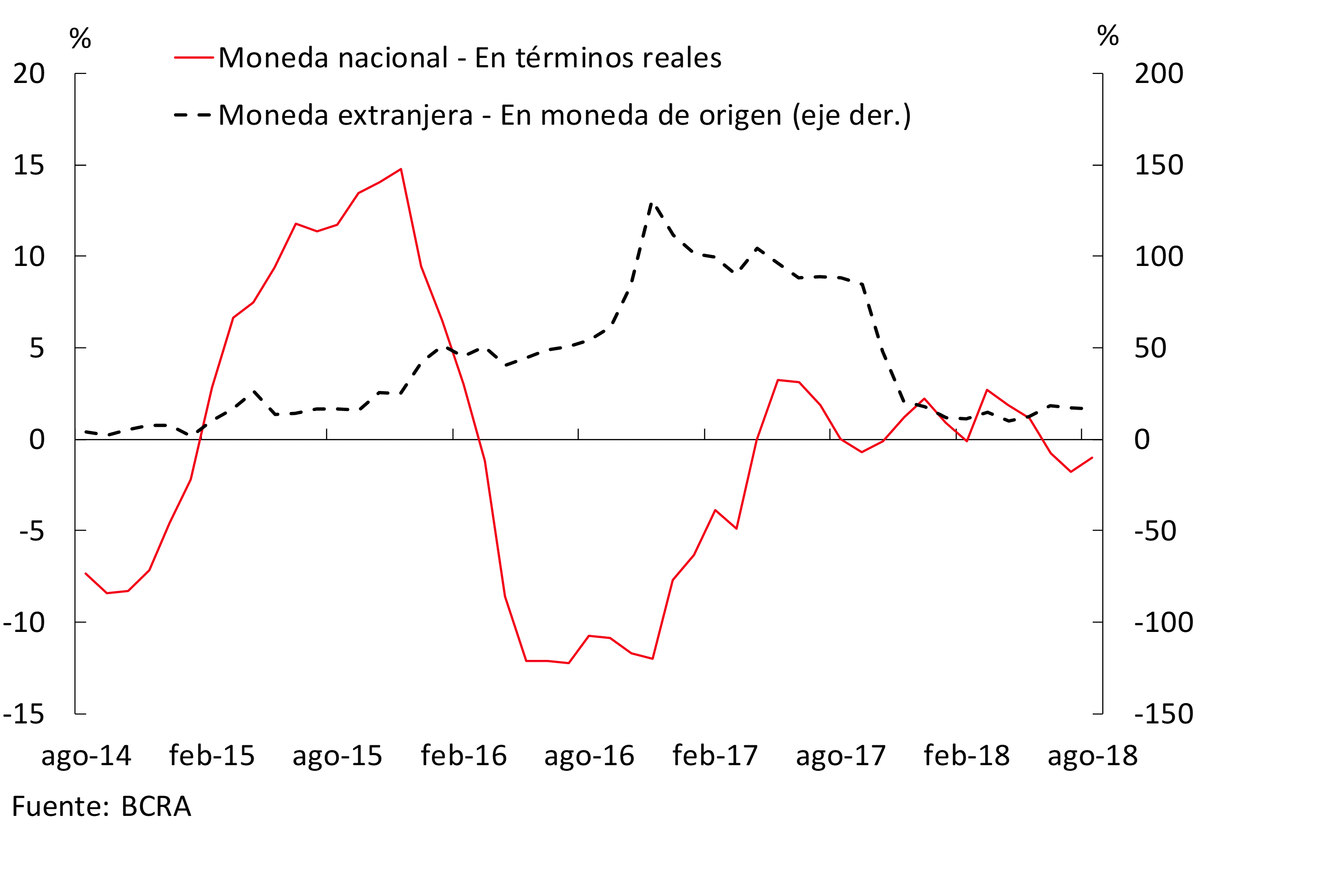 En términos interanuales, el saldo de depósitos totales en moneda nacional creció 13,9% ajustando por inflación, dinámica conducida por las imposiciones del sector público. Los depósitos del sector privado en pesos se redujeron levemente en los últimos doce meses (-1% i.a. real, ver Gráfico 7). Por su parte, las colocaciones totales en moneda extranjera se incrementaron 2,2% —en moneda de origen— respecto a agosto de 2017, con un aumento de 16,4% en las cuentas del sector privado en igual período.