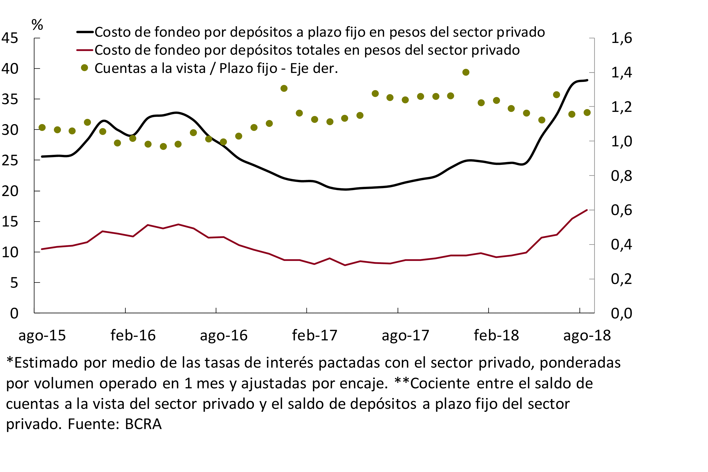 La tasa de interés que los bancos operaron con el sector privado por depósitos a plazo fijo en pesos se incrementó en agosto, hasta 32,8% nominal anual en promedio14. En este contexto, y en el marco del aumento de los encajes, el costo de fondeo estimado por depósitos del sector privado en moneda nacional mostró un ligero aumento en el mes (ver Gráfico 9). Esta suba estuvo levemente atemperada por la mayor ponderación de las colocaciones a la vista en el total de depósitos del sector privado.