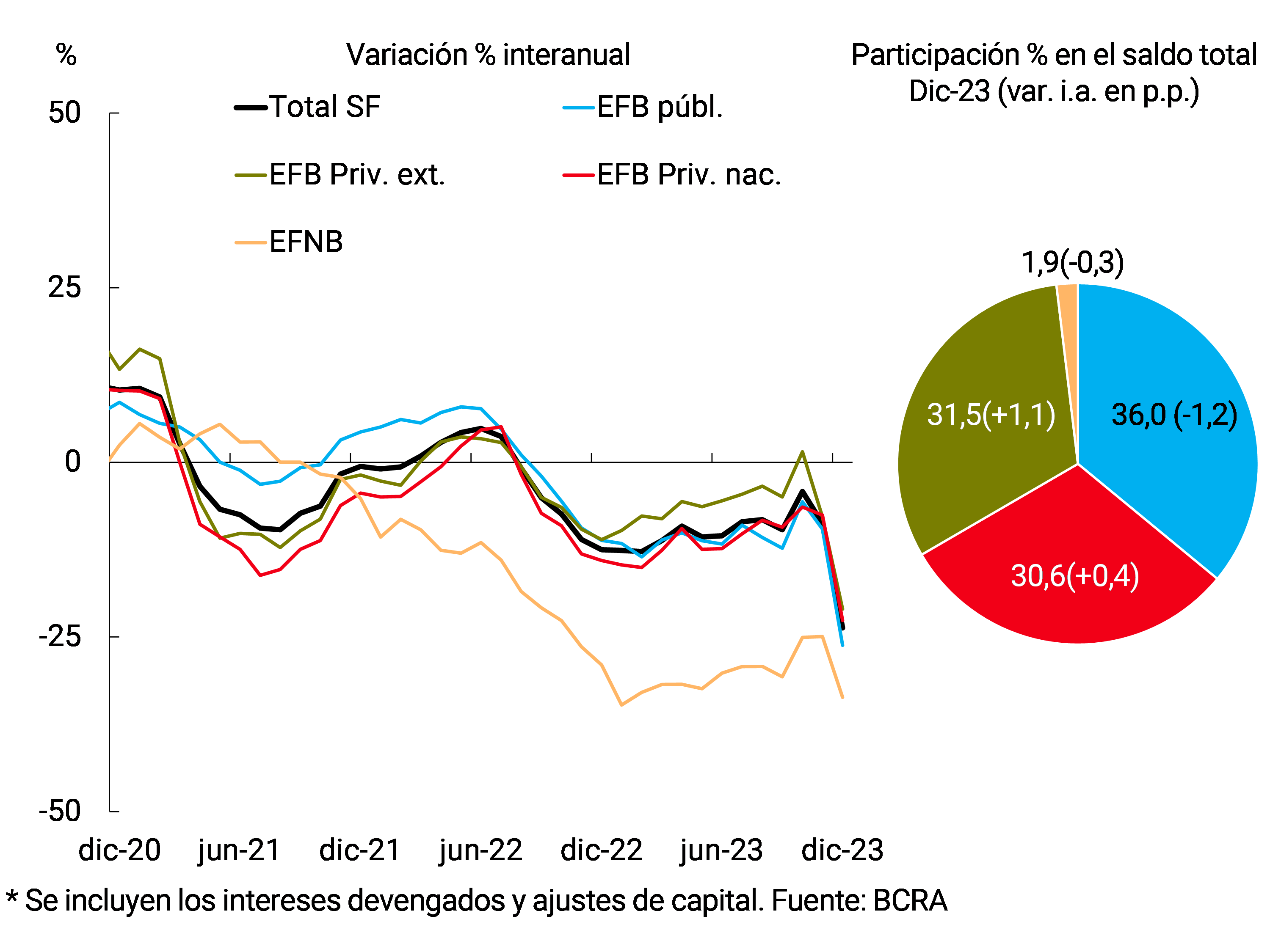 El saldo de financiaciones al sector privado en moneda extranjera se redujo 7,1% en el último mes de 2023, acumulando una disminución de 6,9% i.a.5 De esta manera, el saldo real de préstamos totales (en moneda nacional y extranjera) al sector privado acumuló una caída de 10,7% en el mes (+12% nominal) y de 18,8% en una comparación interanual.
