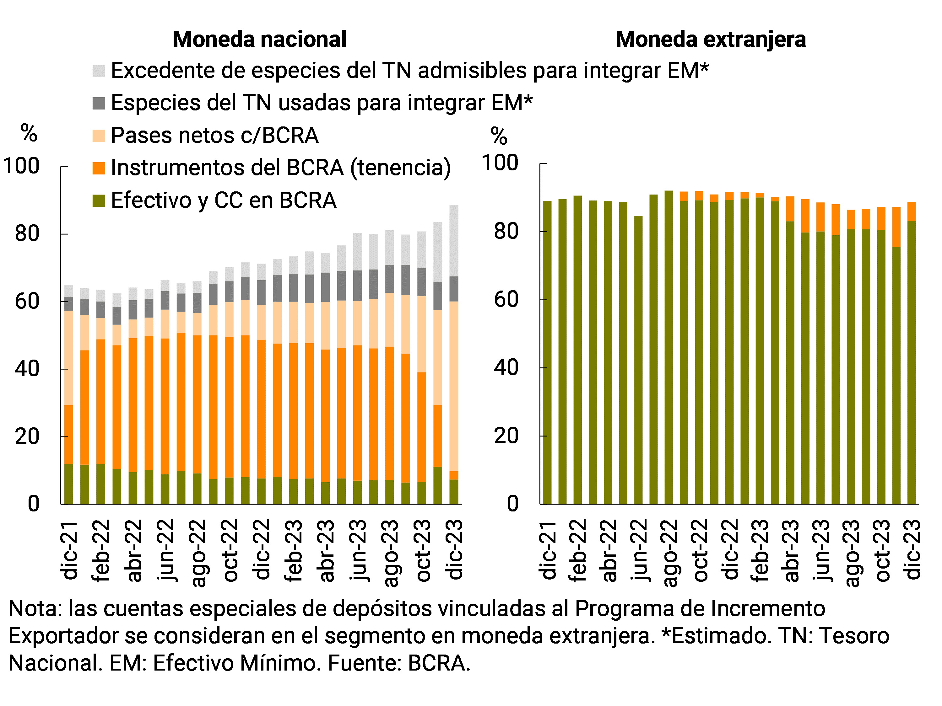 15 Considera disponibilidades, instrumentos del BCRA en moneda nacional y extranjera, y la totalidad de títulos públicos habilitados para utilizar como integración del requerimiento que surge en la norma sobre Efectivo Mínimo.