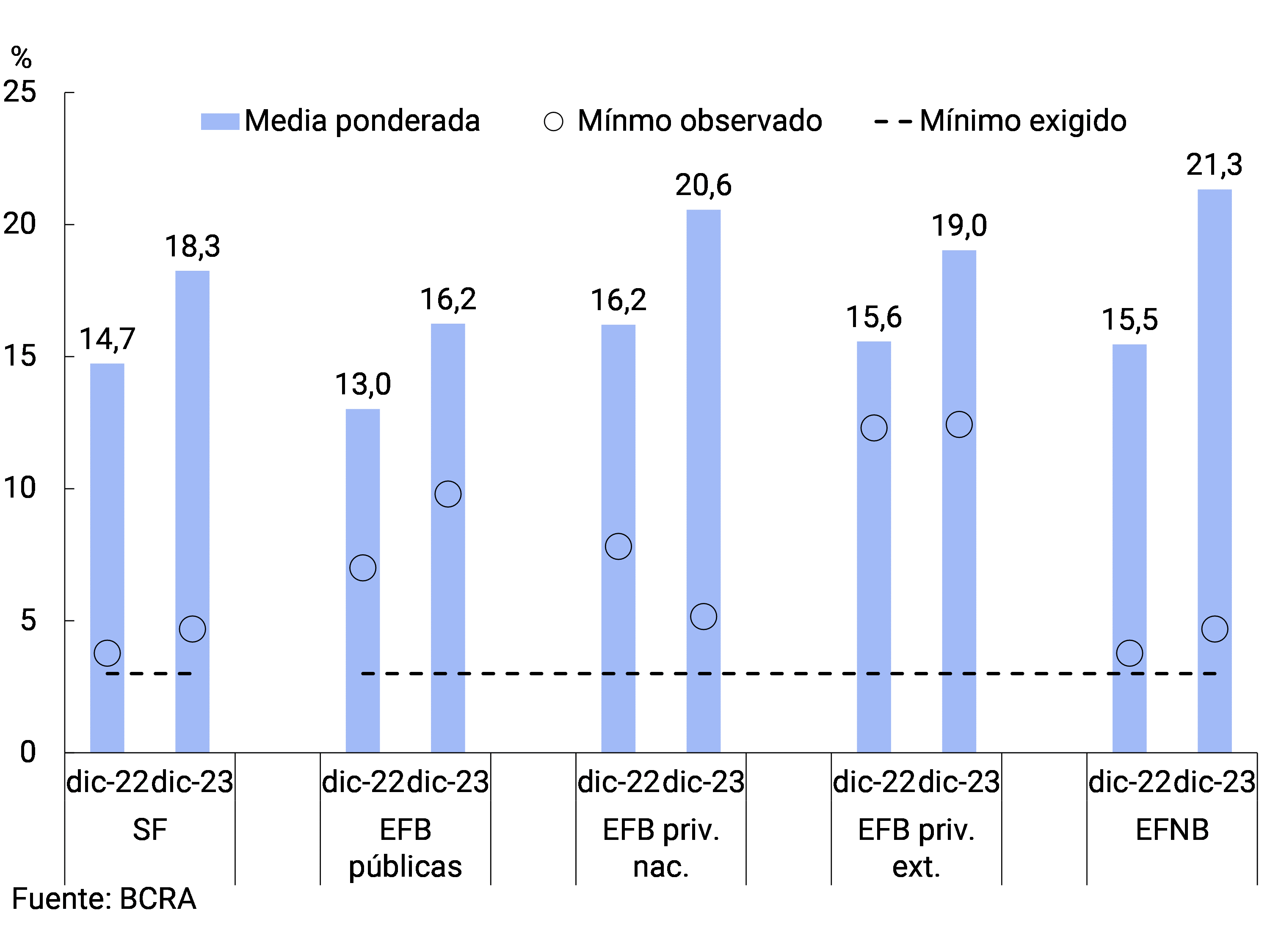 Los ratios de solvencia del sistema financiero también se mantuvieron en niveles altos en el cierre del año. Las entidades financieras integraron capital por el equivalente a 32,4% de los activos ponderados por riesgo (APR) en diciembre, superior al registro del mes previo y de diciembre de 2022. En el período la posición de capital (integración de capital menos exigencia mínima normativa) del sistema financiero totalizó 302,7% de la exigencia en diciembre y 60,2% del saldo de crédito al sector privado neto de previsiones.