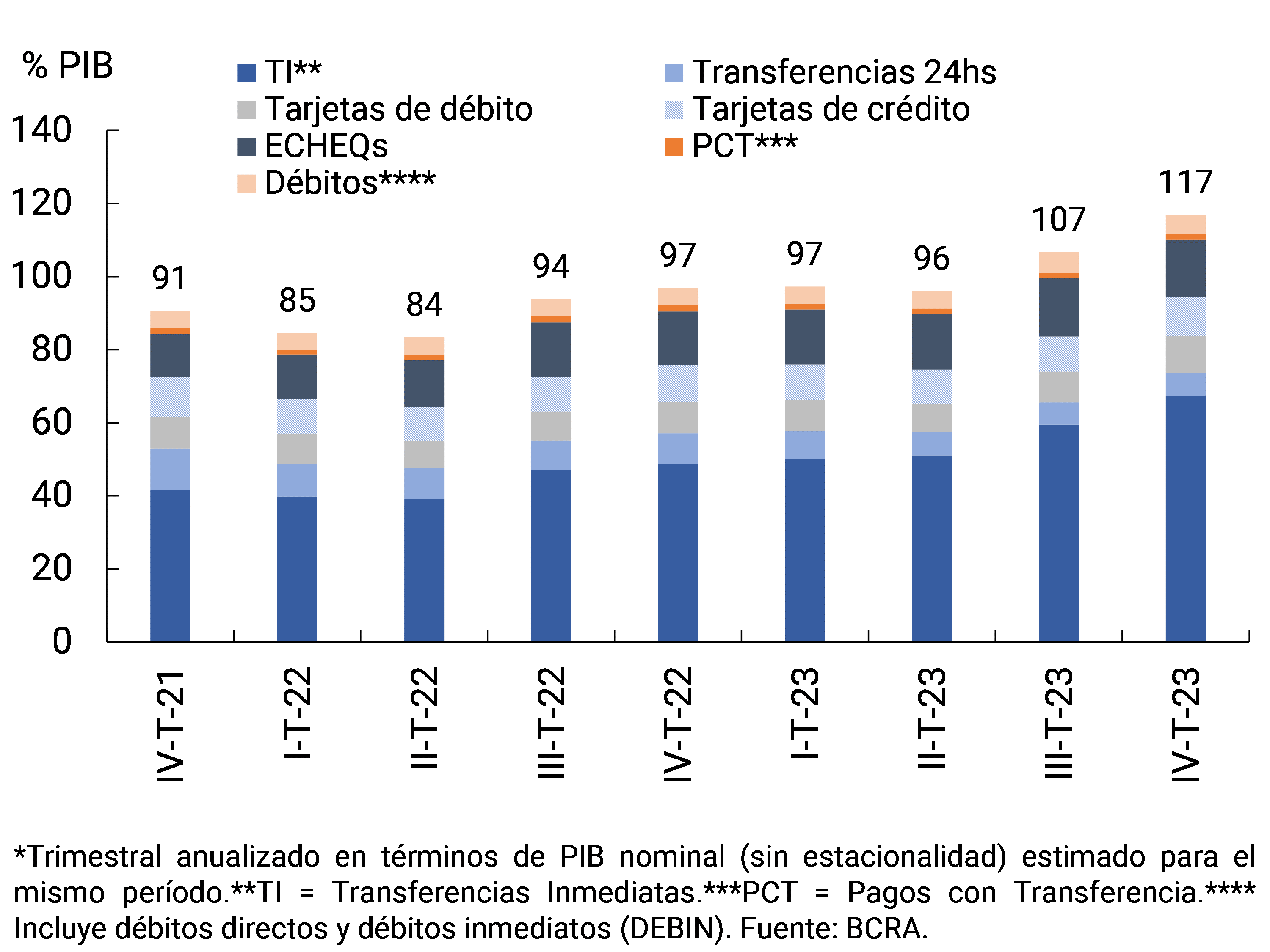 Los avances tecnológicos contribuyeron al aumento de la relevancia de las transacciones de pago electrónico en la economía en los últimos años (ver Gráfico 13). Se estima que la combinación de los principales métodos de pago electrónico en relación con el Producto Interno Bruto (PIB) local creció alrededor de 20 p.p. a lo largo de 2023. Entre los factores que explicaron el desempeño del último año, las transferencias inmediatas (TI) experimentaron un crecimiento de 36,5% en términos reales. Al considerar las TI operadas en el cierre de 2023 (últimos tres meses anualizados), se estima que llegaron a representar el 67,4% del PIB, mostrando un aumento de 18,7 p.p. i.a.