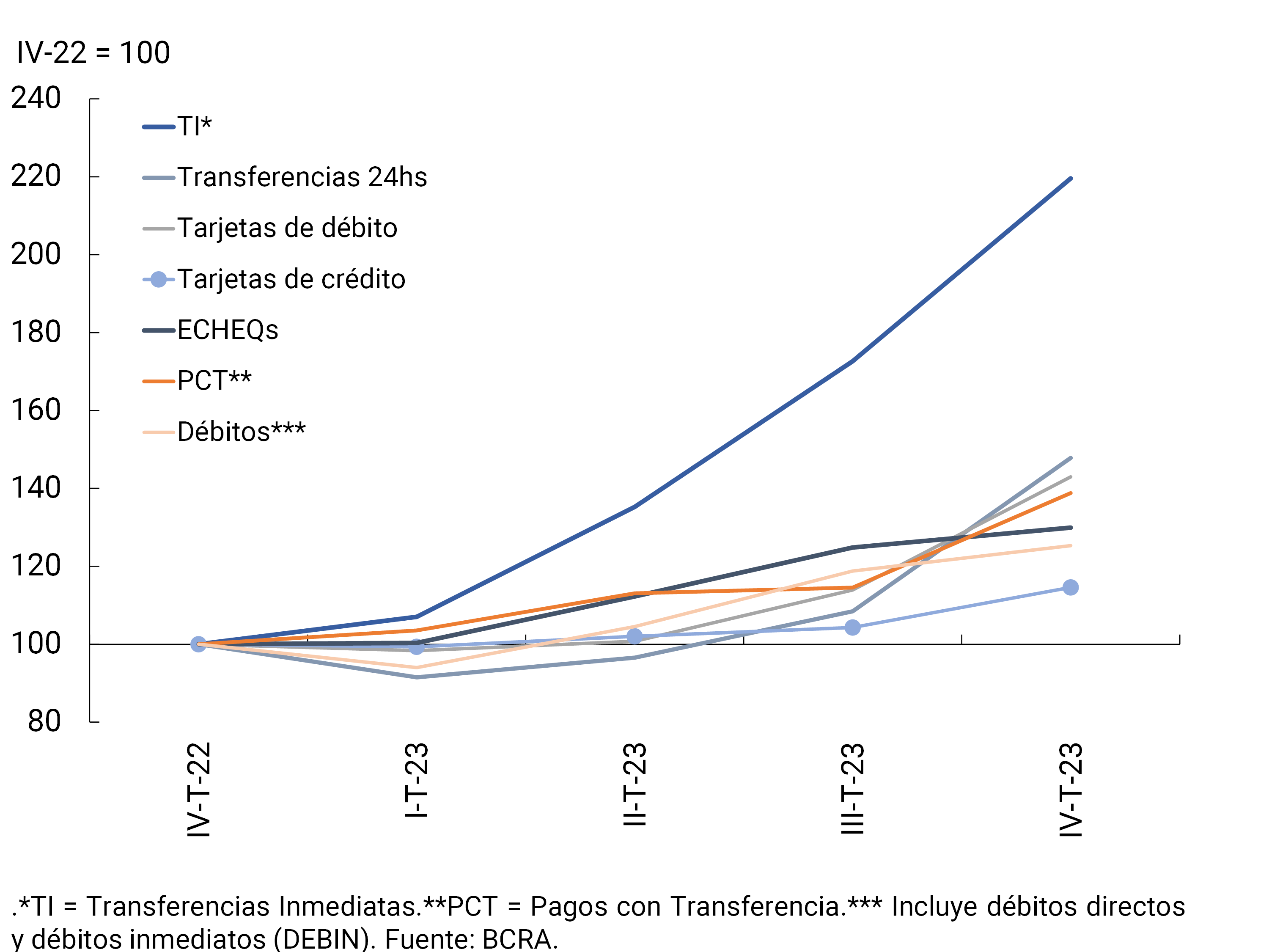 Durante el 2023 los medios de pago electrónicos siguieron expandiéndose en el ámbito minorista, en respuesta al aumento de la demanda por parte de los usuarios y al impulso creciente proveniente del BCRA.
