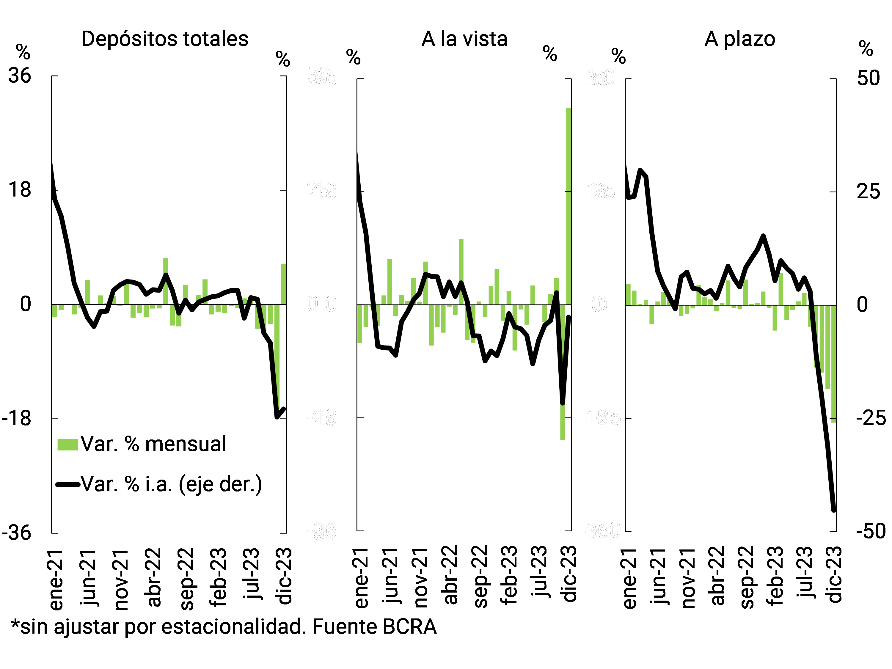 Entre puntas de mes el saldo de los depósitos en pesos del sector privado se incrementó en términos reales, fundamentalmente por la estacionalidad propia de las cuentas a la vista. No obstante, en términos interanuales el saldo de los depósitos del sector privado en pesos acumuló una reducción de 22,8% a precios constantes.