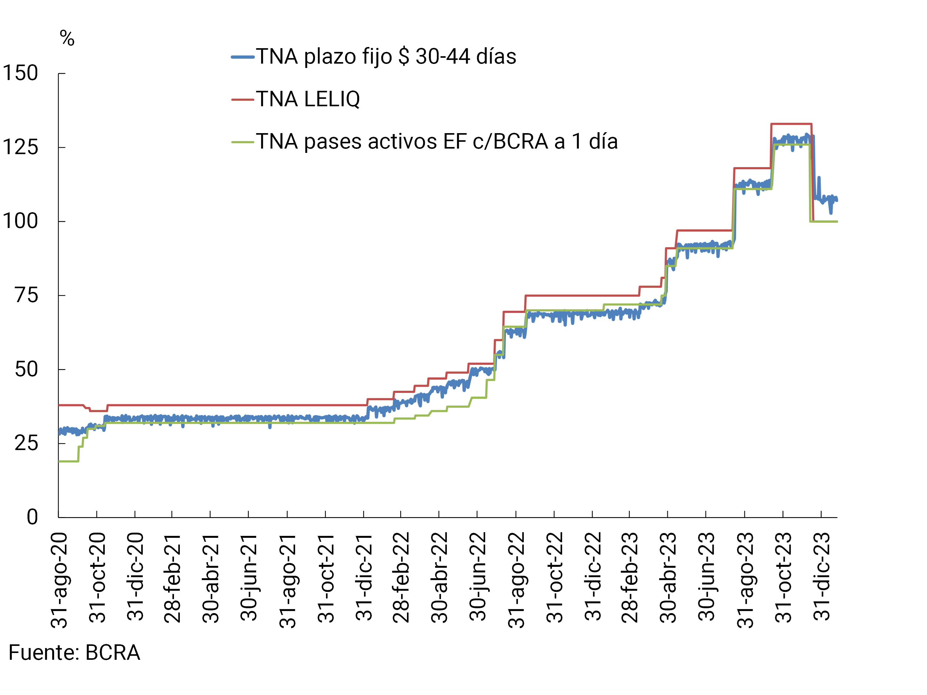 Conforme al nuevo marco de política monetaria y cambiaria difundido el 12 de diciembre de 2023, todas las herramientas se orientarán a alcanzar la estabilidad monetaria y reducir los niveles de inflación. Desde esa fecha el BCRA consideró apropiado disminuir la tasa de pases pasivos a 100% (TNA) (ver Gráfico 3). A partir del 19 de diciembre el BCRA adoptó también varias medidas con el propósito de clarificar y simplificar la señal de tasa de política monetaria. La tasa de política monetaria pasó a ser la de los pases pasivos para el BCRA a un día de plazo. A su vez dejó de realizar licitaciones de LELIQ, pasando a ser las operaciones de pases pasivos el principal instrumento de absorción de excedentes monetarios. De esta manera, se contribuye a la generación de incentivos para que las entidades incrementen la intermediación financiera, en lugar de colocar los fondos en pasivos remunerados del BCRA. También en diciembre se estableció la tasa de interés mínima para los depósitos a plazo fijo en 110% (TNA) y se consideró prudente que el sistema bancario continúe ofreciendo depósitos a plazo fijo ajustables por UVA, eliminando la tasa mínima de precancelación para estos.7 Por último, sobre fines de diciembre de 2023 el BCRA extendió a 180 días el plazo mínimo para los depósitos en UVA pre-cancelables y dispuso que las entidades deban ofrecer la captación de estas imposiciones por hasta $5 millones por cliente, pudiendo aceptarlas por importes superiores.8