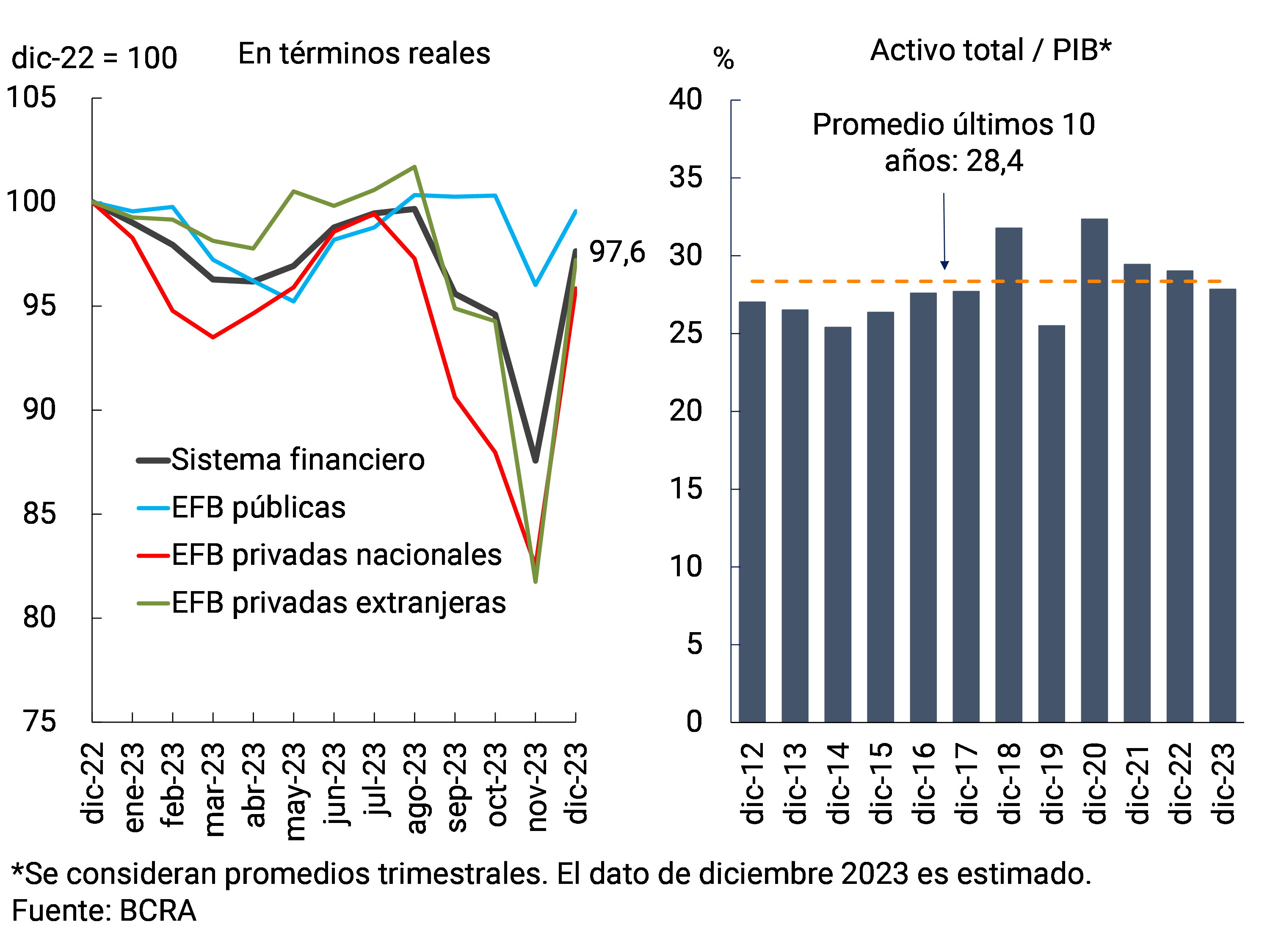 El activo total del sistema financiero creció 11,5% en términos reales en diciembre,10 dinámica impulsada mayormente por las entidades financieras privadas (ver Gráfico 4). No obstante, a lo largo de 2023 el activo total del sector acumuló una leve reducción (-2,4% a precios constantes). Se estima que el activo del agregado de entidades representó 27,8% del PIB a fines de 2023, levemente por debajo del nivel observado un año atrás (de 29%) y del promedio de los últimos 10 años (de 28,4%).