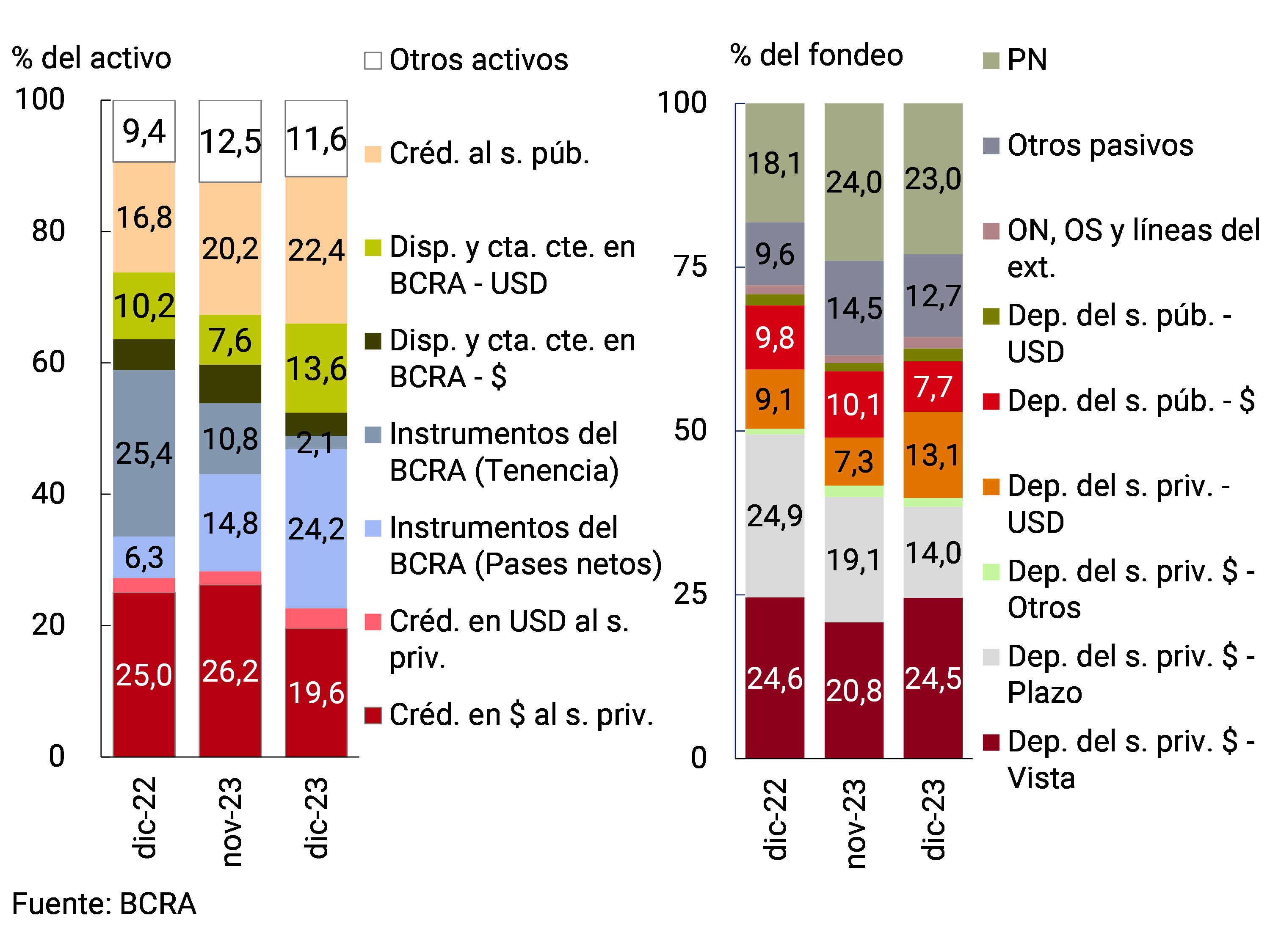 Con respecto a la composición del activo total del sector, en diciembre se verificó un aumento del peso relativo de los pases netos con el BCRA (en línea con el objetivo de esta Institución, tendiente a que los pases sean el principal instrumento de absorción de excedentes monetarios). En menor medida también se incrementó la relevancia de las disponibilidades y cuentas corrientes en moneda extranjera y del financiamiento al sector público. Por su parte, el crédito al sector privado en pesos y la tenencia de instrumentos del BCRA redujeron su participación en el total durante el período (ver Gráfico 5). Considerando los componentes más relevantes del fondeo total, en el mes los depósitos en moneda extranjera y las cuentas a la vista del sector privado en moneda nacional aumentaron su importancia relativa, mientras que las colocaciones a plazo en pesos del sector privado y los depósitos en igual denominación del sector público redujeron su ponderación en el fondeo total.