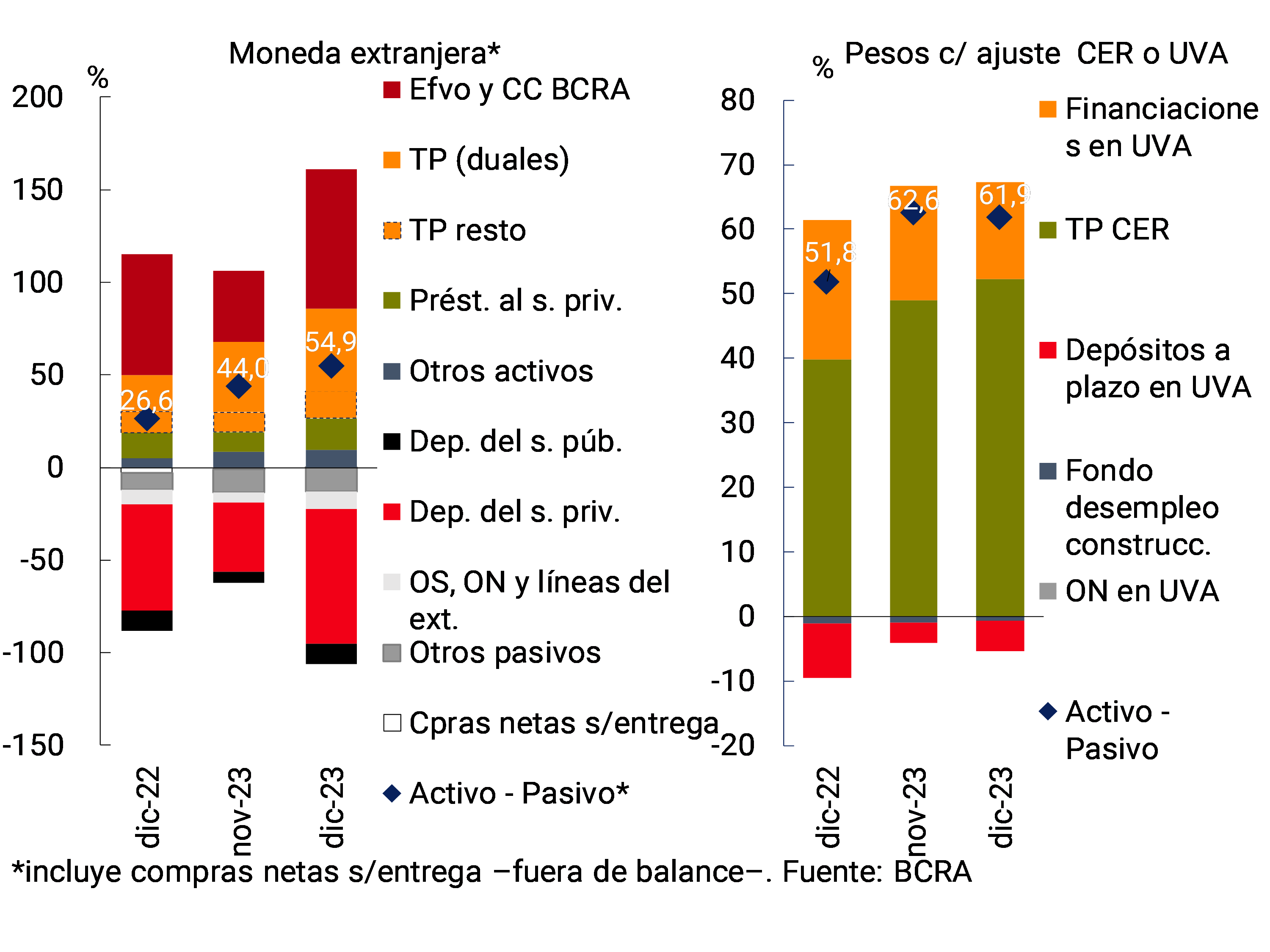 12 Incluye operaciones de compra y venta a término de moneda extranjera fuera de balance. Dentro de los pasivos se consideran los depósitos que poseen retribución variable en función de la evolución del tipo de cambio –asociadas al Programa de Incremento Exportador– y dentro del activo se computan las LEDIV del BCRA.