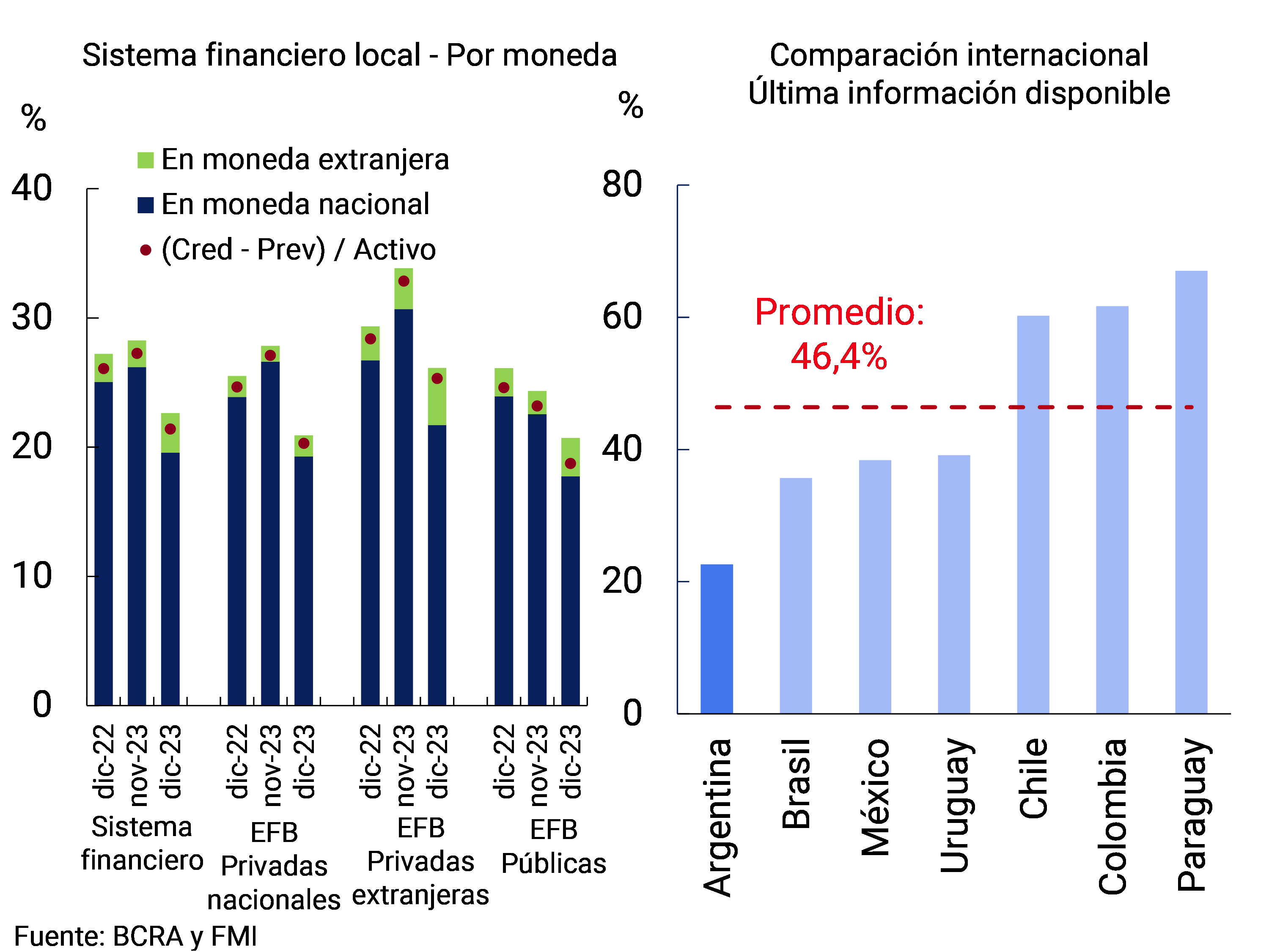 La exposición bruta al sector privado del conjunto de entidades financieras totalizó 22,6% del activo total sobre el cierre de 2023, reduciéndose 5,6 p.p. en el mes y 4,6 p.p. con respecto al registro de un año atrás. Este indicador resulta inferior al promedio de los últimos 10 años (de 39,2%) y a los niveles observados en otros países de la región (ver Gráfico 7). El desempeño mensual se reflejó en todos los grupos de entidades financieras, recogiendo el efecto de una caída del saldo real del crédito al sector privado (ver Sección I) y un incremento del activo del sistema financiero en términos reales (ver Sección II). Dentro del segmento en pesos, en diciembre este cociente se ubicó en 19,6% (-6,6 p.p. mensual y -5,5 p.p. i.a.) para el agregado del sistema financiero. Al deducir el saldo de previsiones, el financiamiento total al sector privado representó 21,4% del activo a nivel sistémico.