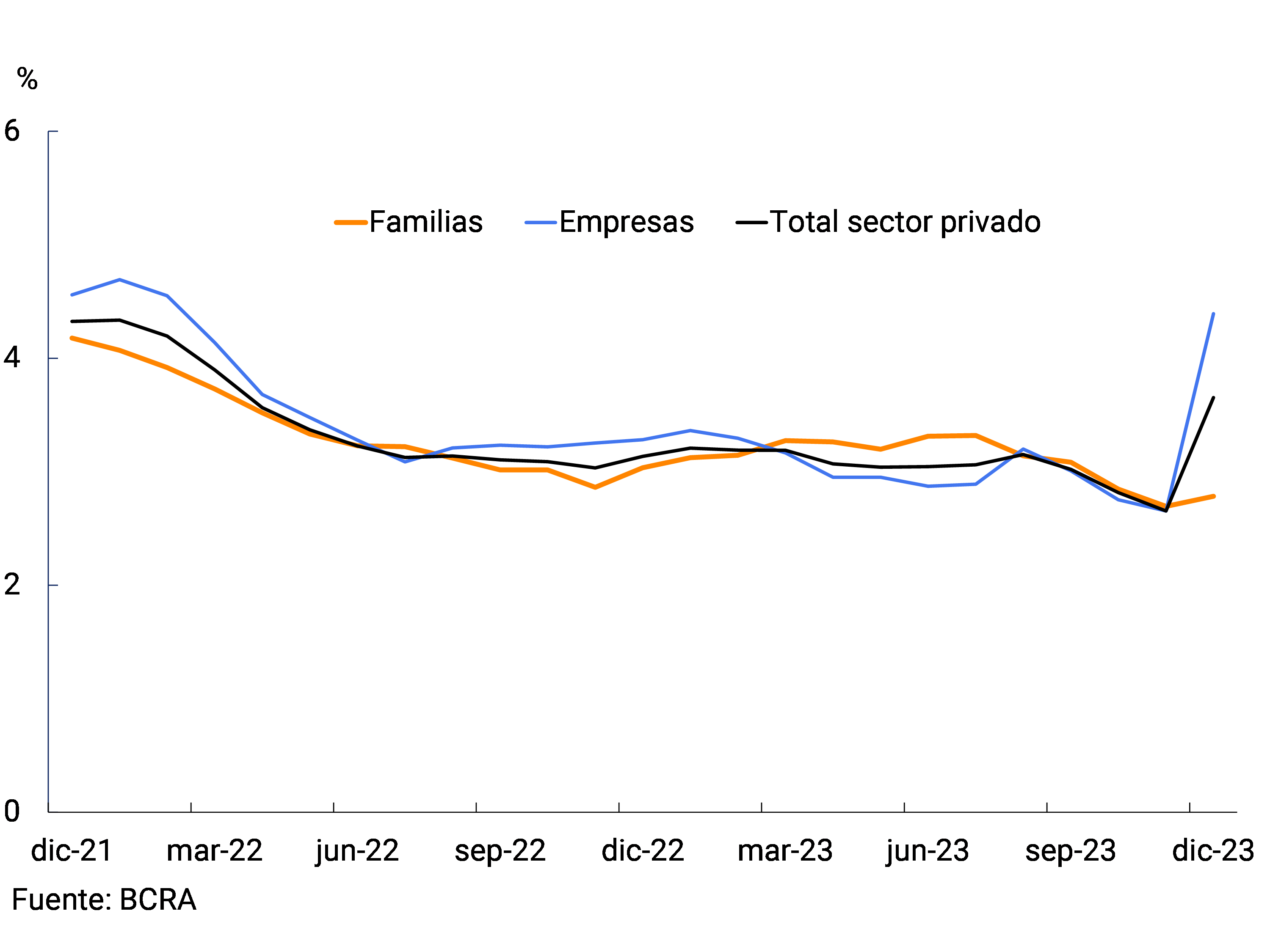 El ratio de irregularidad del crédito al sector privado cerró 2023 en 3,7%, aumentando 0,5 p.p. i.a. El indicador de morosidad de los préstamos a las empresas alcanzó 4,4% en diciembre, mientras que la mora de las financiaciones a las familias se situó en 2,8% de la cartera.