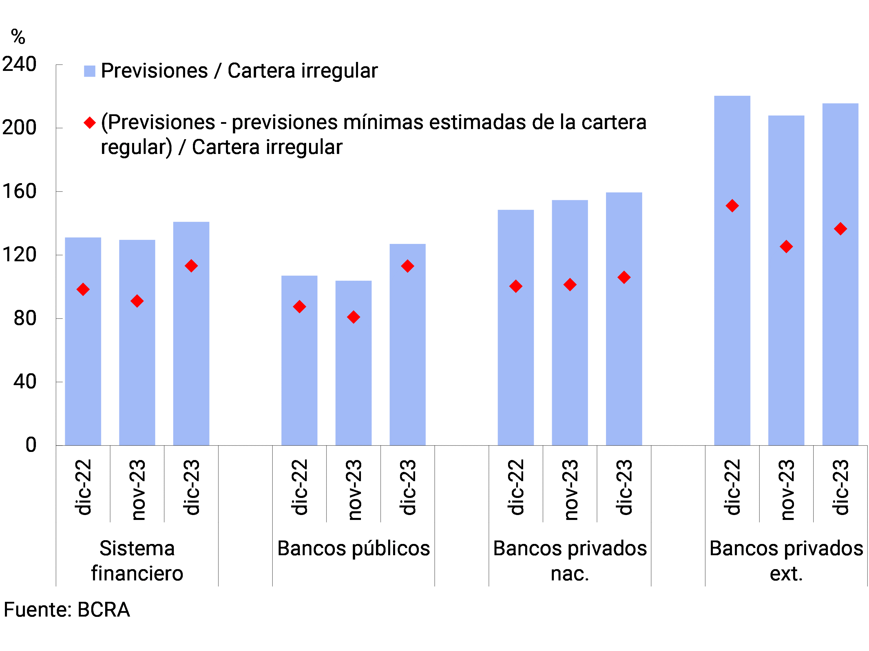 El sistema financiero mantuvo elevados niveles de previsionamiento durante 2023. En diciembre el saldo de previsiones totales del conjunto de entidades representó 141% del crédito en situación irregular (+9,9 p.p. i.a.; ver Gráfico 9) y 5,1% de las financiaciones totales al sector privado (+1 p.p. i.a.). El saldo de previsiones netas de aquellas que corresponden a la cartera en situación regular14 representó 113,2% de dicha cartera.