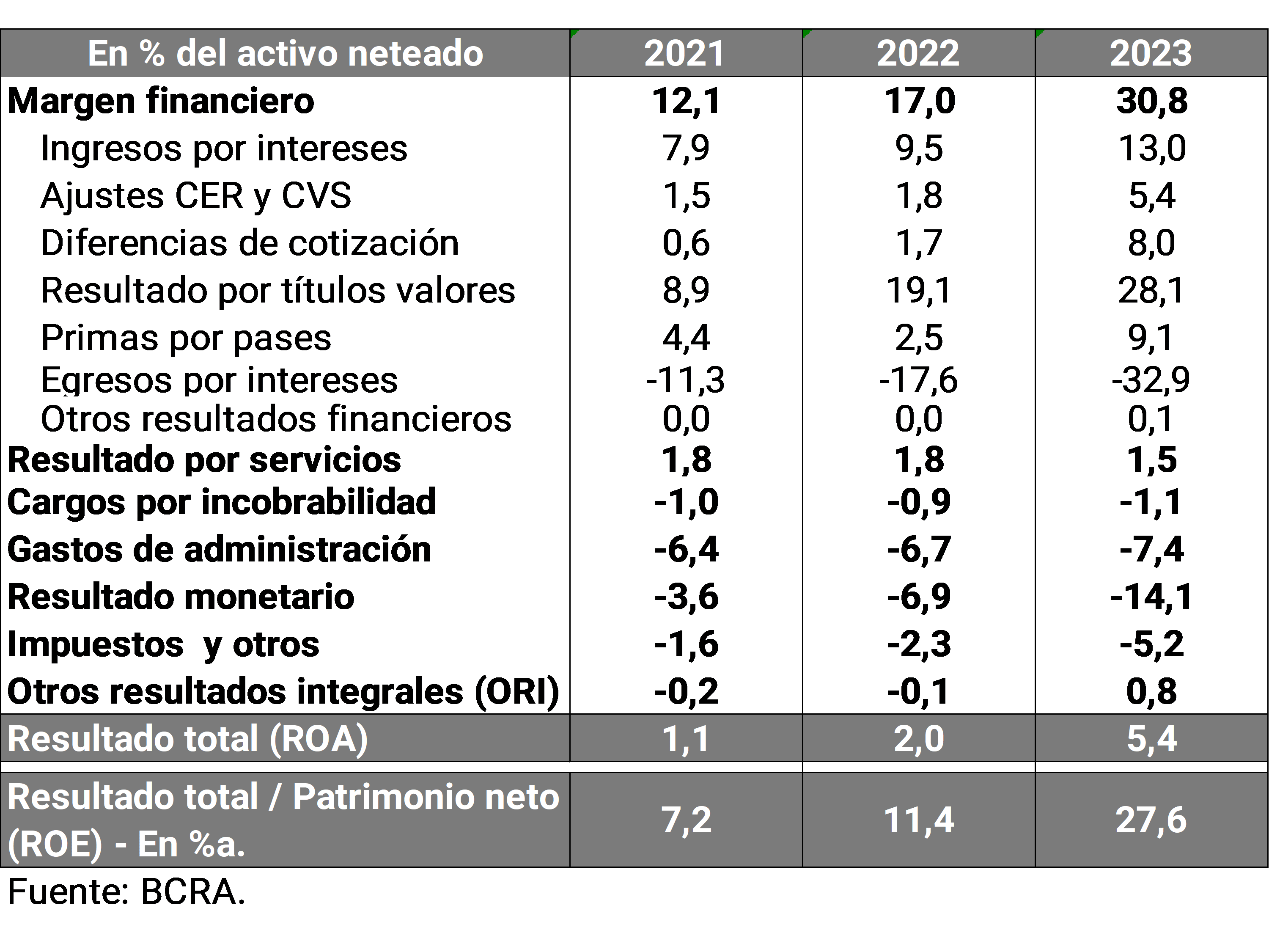 El sistema financiero cerró 2023 con resultados totales integrales en moneda homogénea equivalentes a 5,4% del activo (ROA) y a 27,6% del patrimonio neto (ROE). Estos niveles fueron superiores a los registrados en los 3 años precedentes.