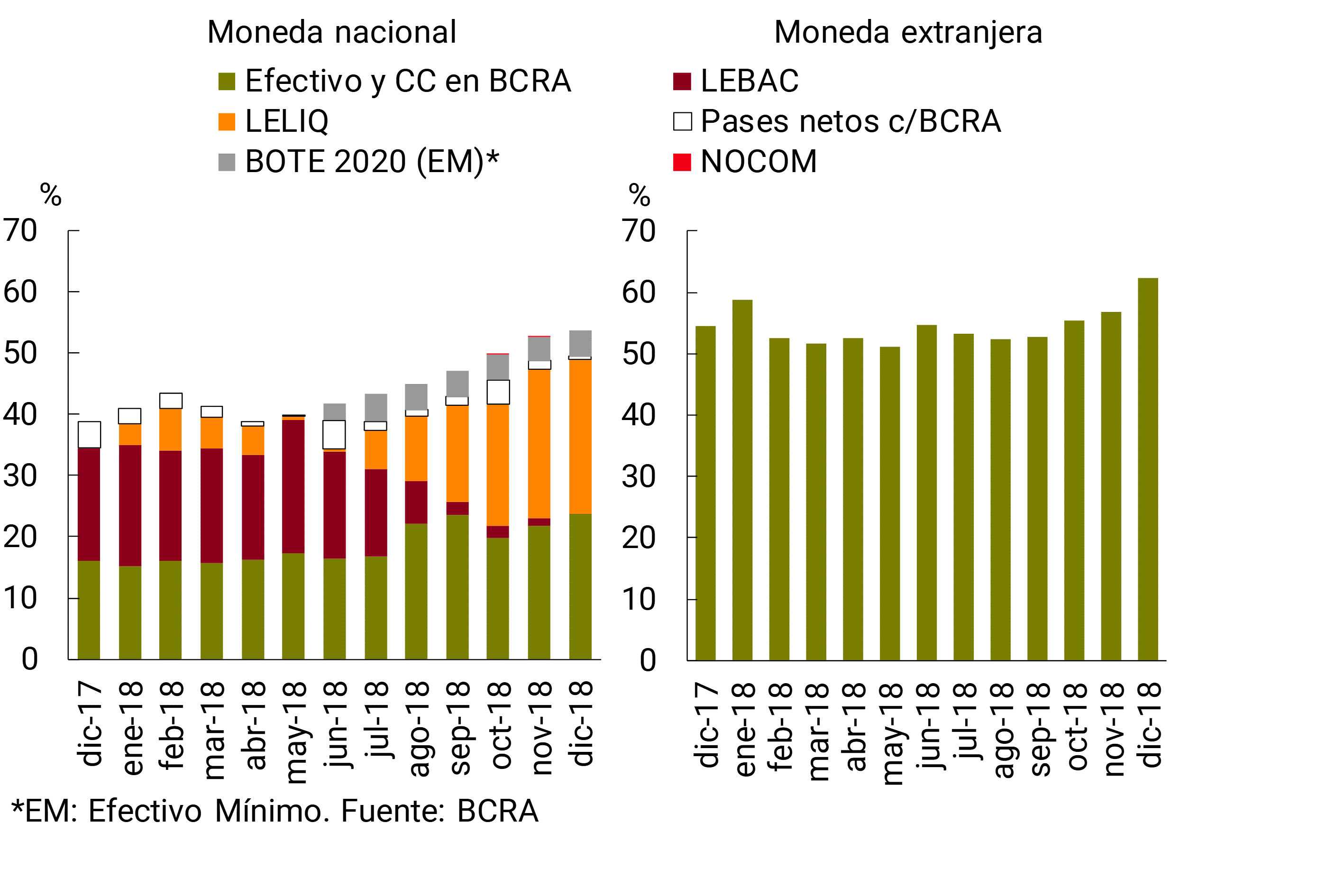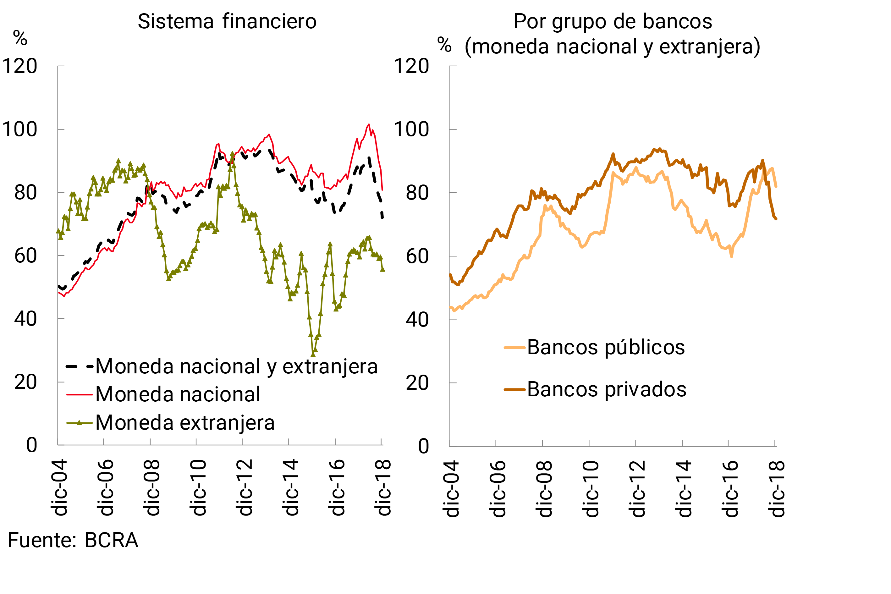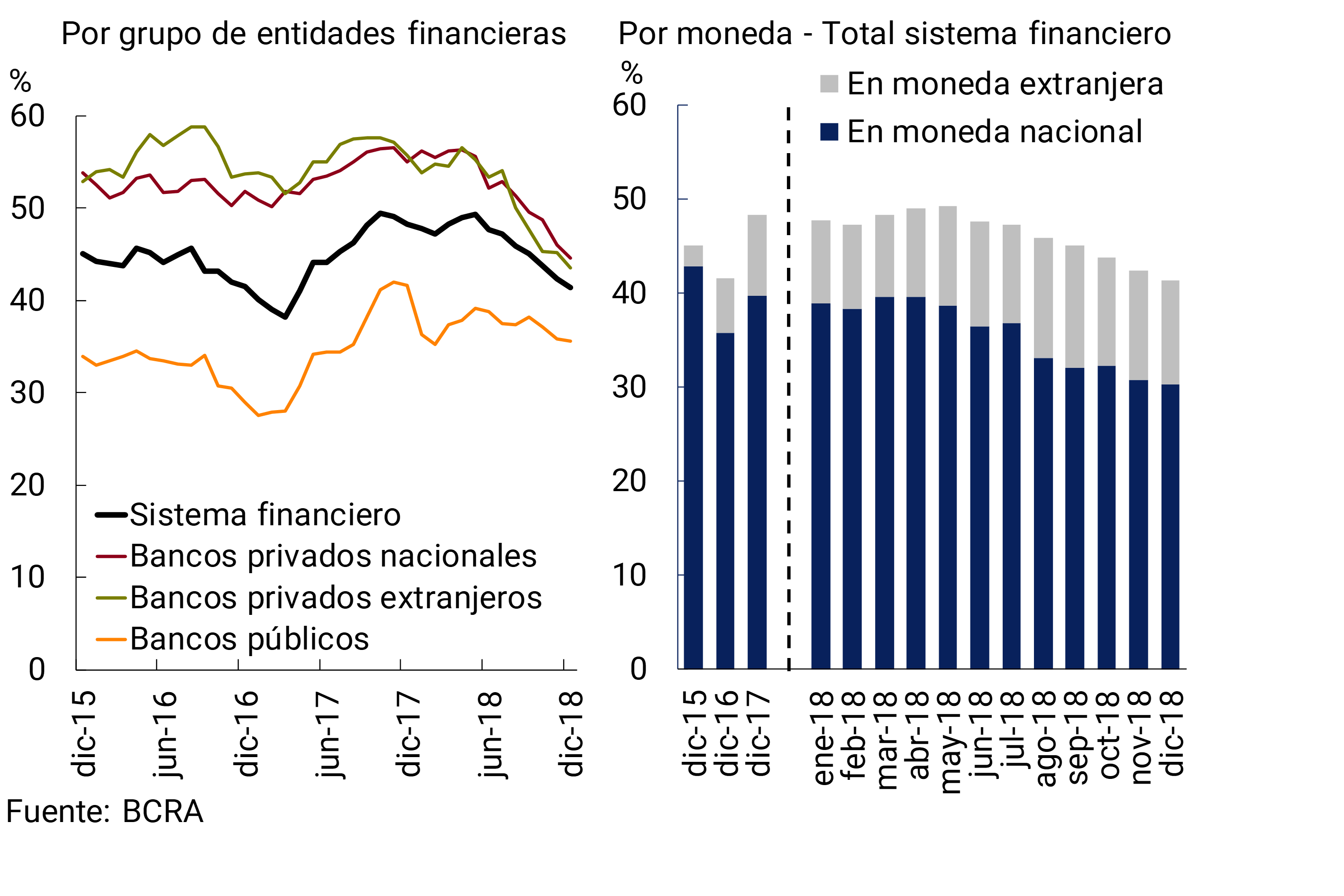 • La liquidez en el sistema financiero alcanzó niveles relativamente altos a fin de 2018. El indicador amplio de liquidez —integración de efectivo mínimo, instrumentos del BCRA y disponibilidades, en moneda nacional y extranjera— se ubicó en torno a 56,4% de los depósitos totales (53,7% considerando sólo las partidas en pesos), aumentando 2,3 p.p. con respecto a noviembre (+0,9 p.p. considerando sólo las partidas en pesos). En 2018, el indicador amplio de liquidez del conjunto de entidades financieras aumentó 13,8 p.p.