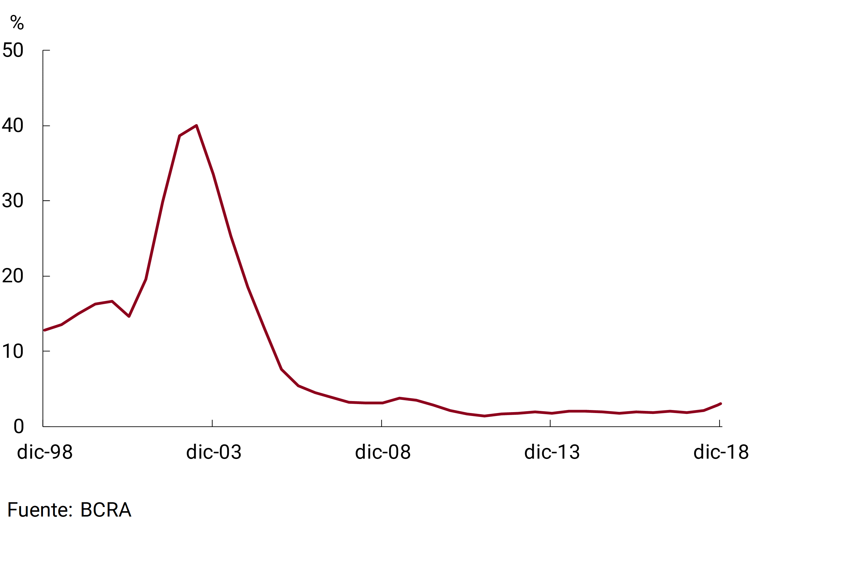 21 En 2018 los bancos privados acumularon un ROA nominal de 4,3% (+1 p.p.i.a.) y un ROE nominal de 35,9% (+9,3 p.p.i.a.) y los bancos públicos un ROA nominal de 3,4% (+1,4 p.p.i.a.) y un ROE nominal de 33,7% (+15,1 p.p.i.a.).