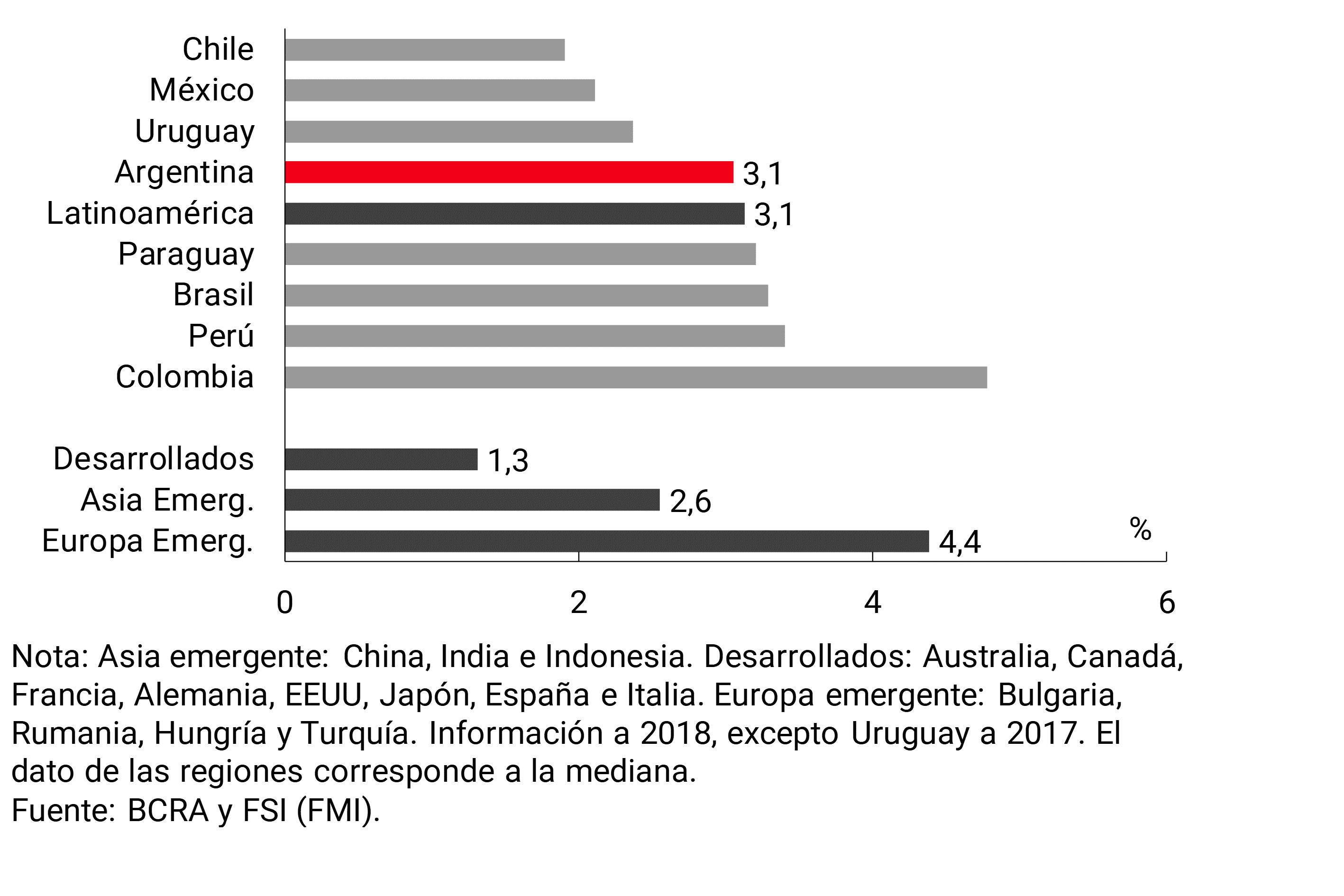 El ratio de morosidad de las financiaciones al sector privado se ubicó en 3,1% en el cierre del 2018, incrementándose 0,2 p.p. respecto al valor del mes de noviembre y 1,2 p.p. en comparación con el nivel de fines de 2017. No obstante, cabe señalar que los niveles de irregularidad del financiamiento bancario al sector privado continúan en niveles bajos en una comparación histórica y respecto a los valores observados en otras economías de la región y emergentes (ver Gráfico 11 y 12).