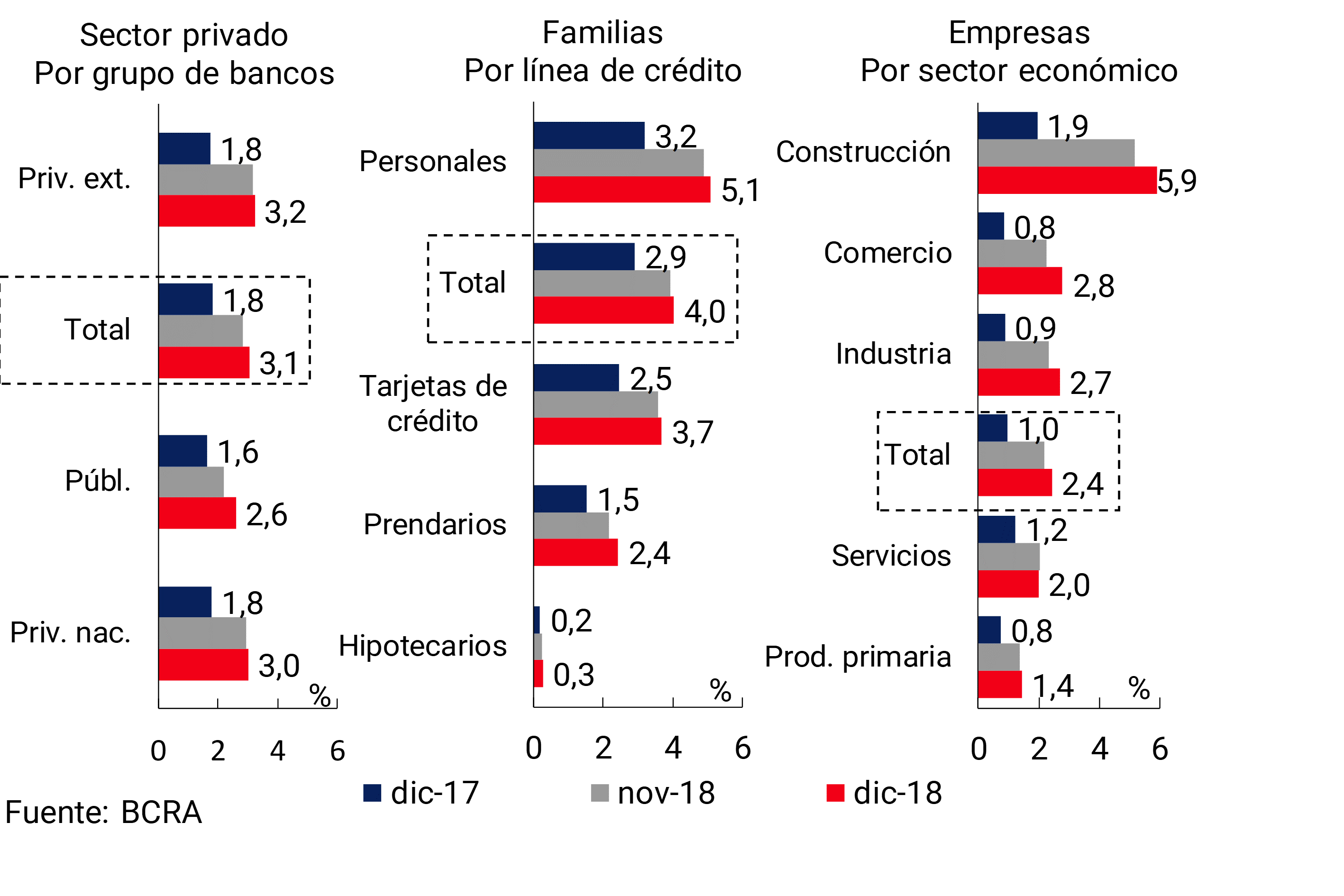 Desagregando por sector, en el último mes de 2018 el coeficiente de mora de los créditos a las empresas se incrementó 0,3 p.p. respecto del valor de noviembre, hasta ubicarse en 2,4% en diciembre (ver Gráfico 13). En una comparación interanual dicho indicador acumuló una suba de 1,5 p.p, debido fundamentalmente al comportamiento de los préstamos a la construcción, al comercio y a la industria.