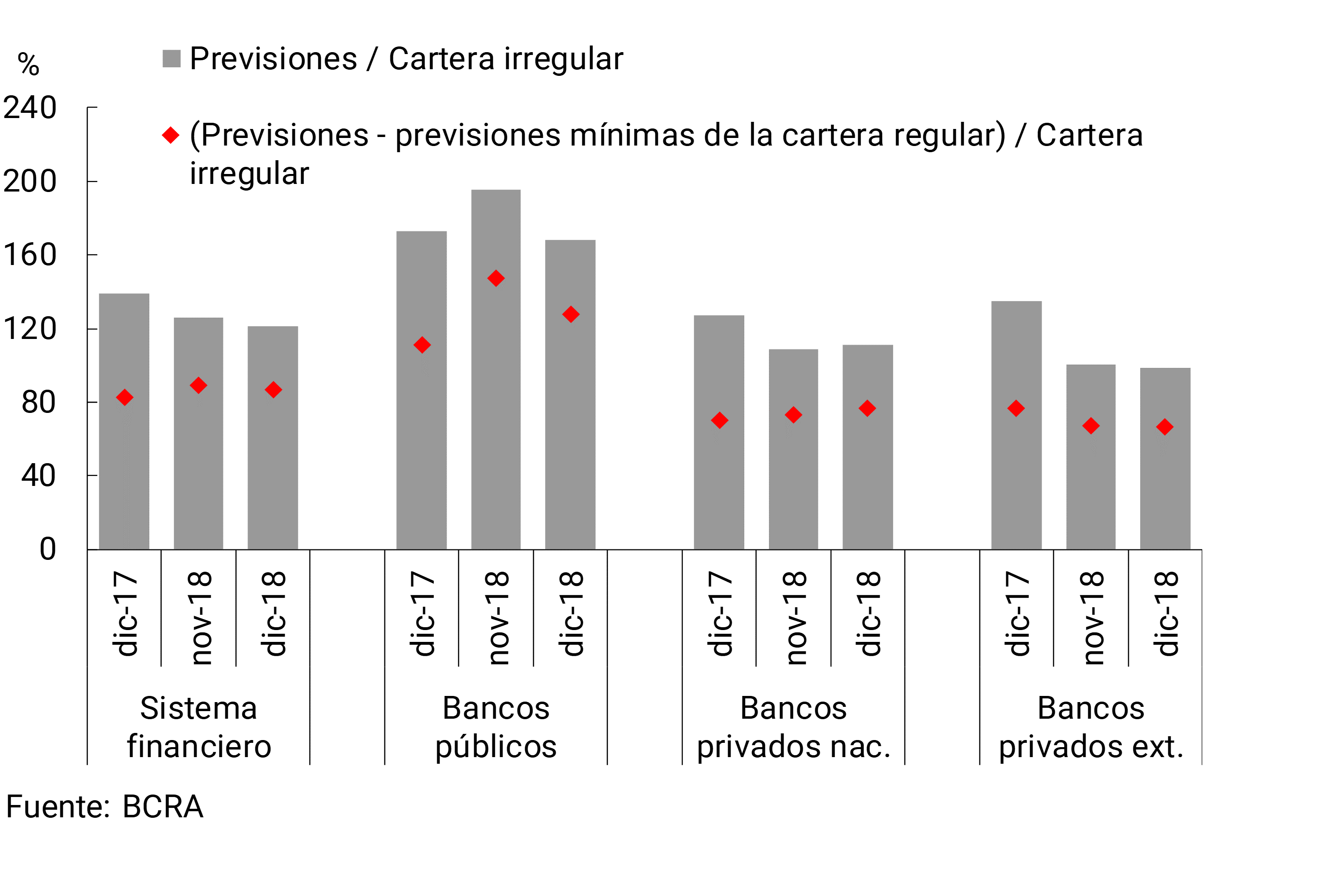 El conjunto de bancos cerró el 2018 con elevados niveles de previsionamiento. Si se excluye la estimación de las previsiones mínimas atribuibles a la cartera regular, el previsionamiento del sistema financiero agregado se situaría en 87% de la cartera en situación irregular en el mes (ver Gráfico 14). El saldo total de previsiones contables representó 121% de la cartera en situación irregular del sector privado en diciembre, levemente por debajo del valor del mes pasado y del nivel de un año atrás.
