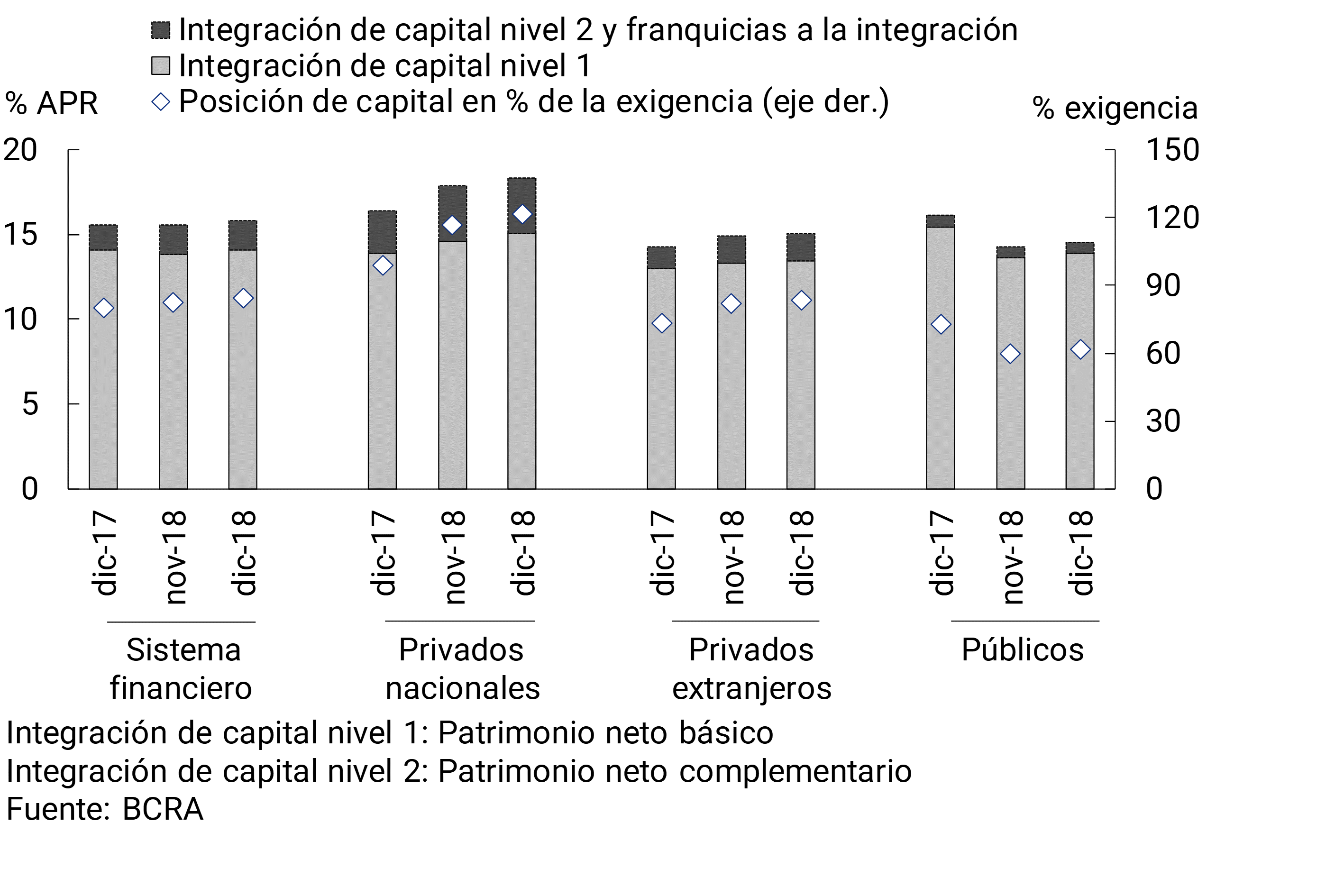 El sistema financiero cerró 2018 con valores relativamente elevados para los indicadores de solvencia (ver Gráfico 15). La integración de capital regulatorio representó 15,8% de los activos ponderados por riesgo (APR) a nivel agregado en diciembre, siendo levemente superior a la de noviembre pasado y a la de fines de 2017. El capital de nivel 1 continuó explicando casi 90% de la integración total.20 Por su parte, el exceso de integración de capital totalizó 85% de la exigencia normativa. Todos los grupos de bancos presentaron un exceso de integración de capital con respecto al requisito mínimo prudencial. El apalancamiento del conjunto de entidades financieras continuó siendo moderado. El coeficiente de apalancamiento (en el marco de lo recomendado por el Comité de Basilea) alcanzó 8,8% en diciembre, superando ampliamente al mínimo requerido de 3% (ver Gráfico 16).