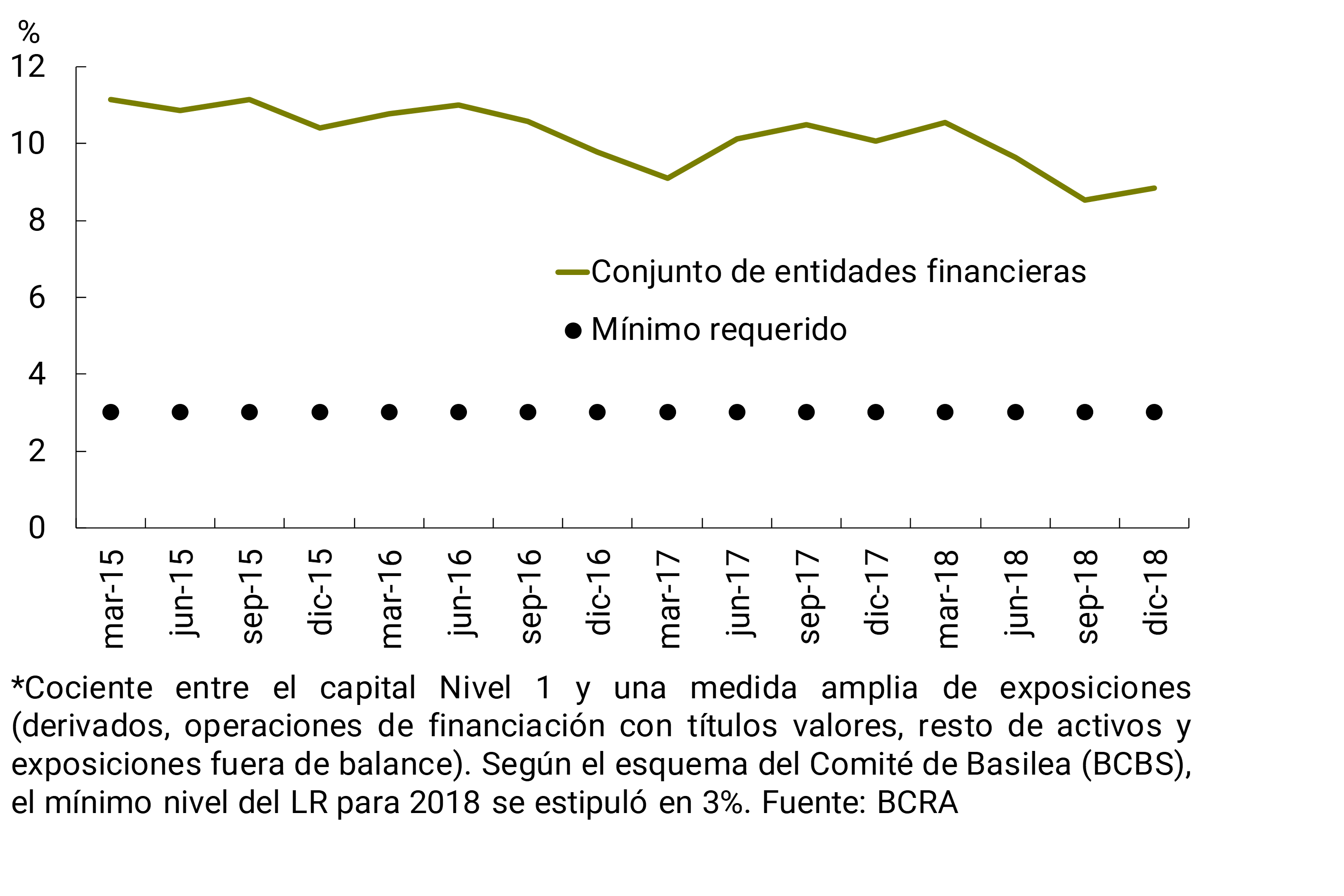 • El conjunto agregado de entidades conservó valores relativamente elevados para los indicadores de solvencia. El capital regulatorio representó 15,8% de los activos ponderados por riesgo (APR) a nivel agregado en diciembre, siendo levemente superior al nivel de noviembre y de fines de 2017. El apalancamiento total del conjunto de entidades financieras continuó siendo moderado. El coeficiente de apalancamiento, en el marco de lo recomendado por el Comité de Basilea, alcanzó 8,8% en diciembre, superando ampliamente al mínimo requerido de 3%.