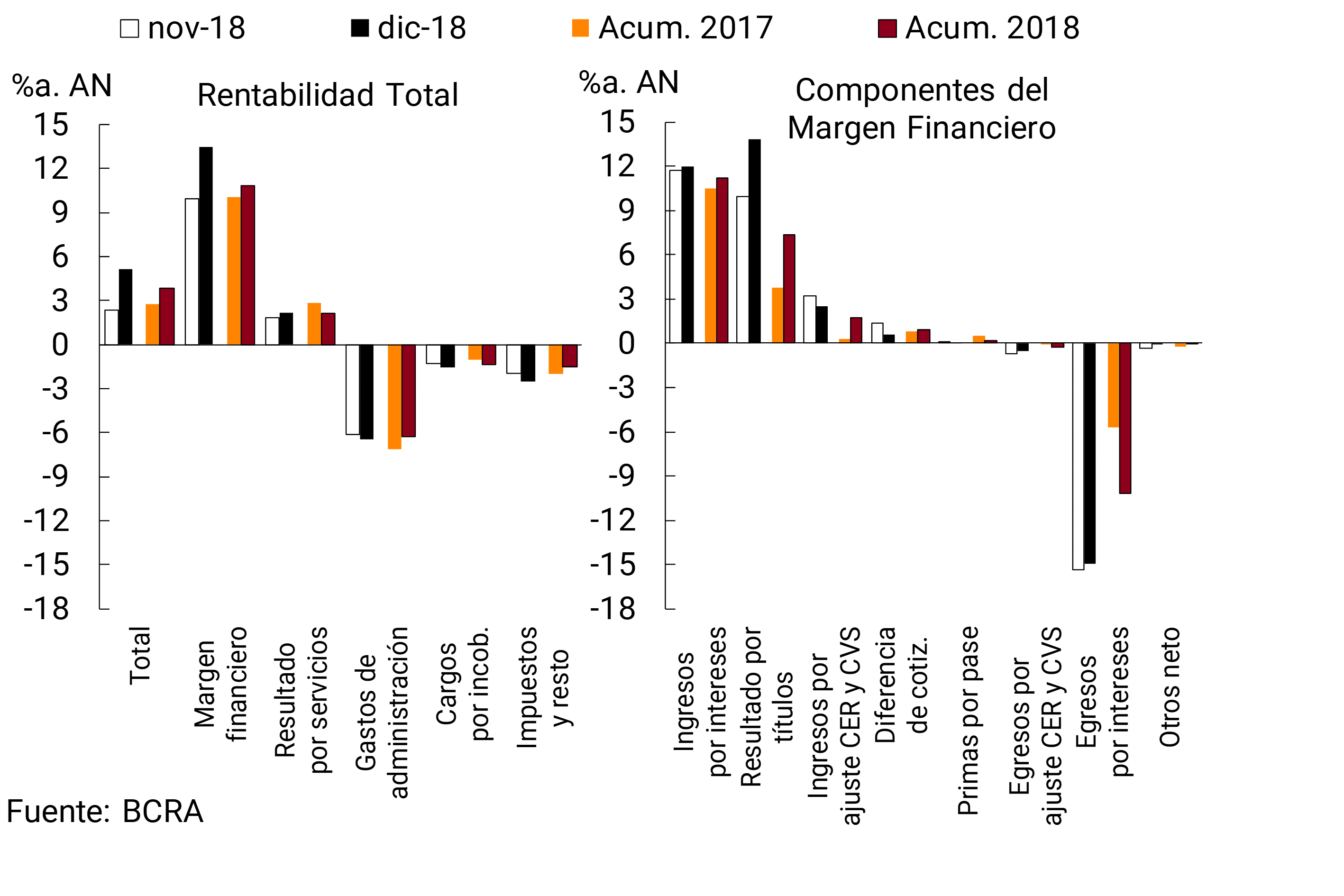 • En diciembre el sistema financiero devengó ganancias mensuales nominales equivalentes a 5,1% anualizado del activo —ROA—. En todo 2018 el sistema financiero registró utilidades nominales anuales equivalentes a 3,9% del activo y 34,4% del patrimonio neto, aumentando 1,1 p.p. del activo y 11,1 p.p. del patrimonio neto con respecto a 2017.