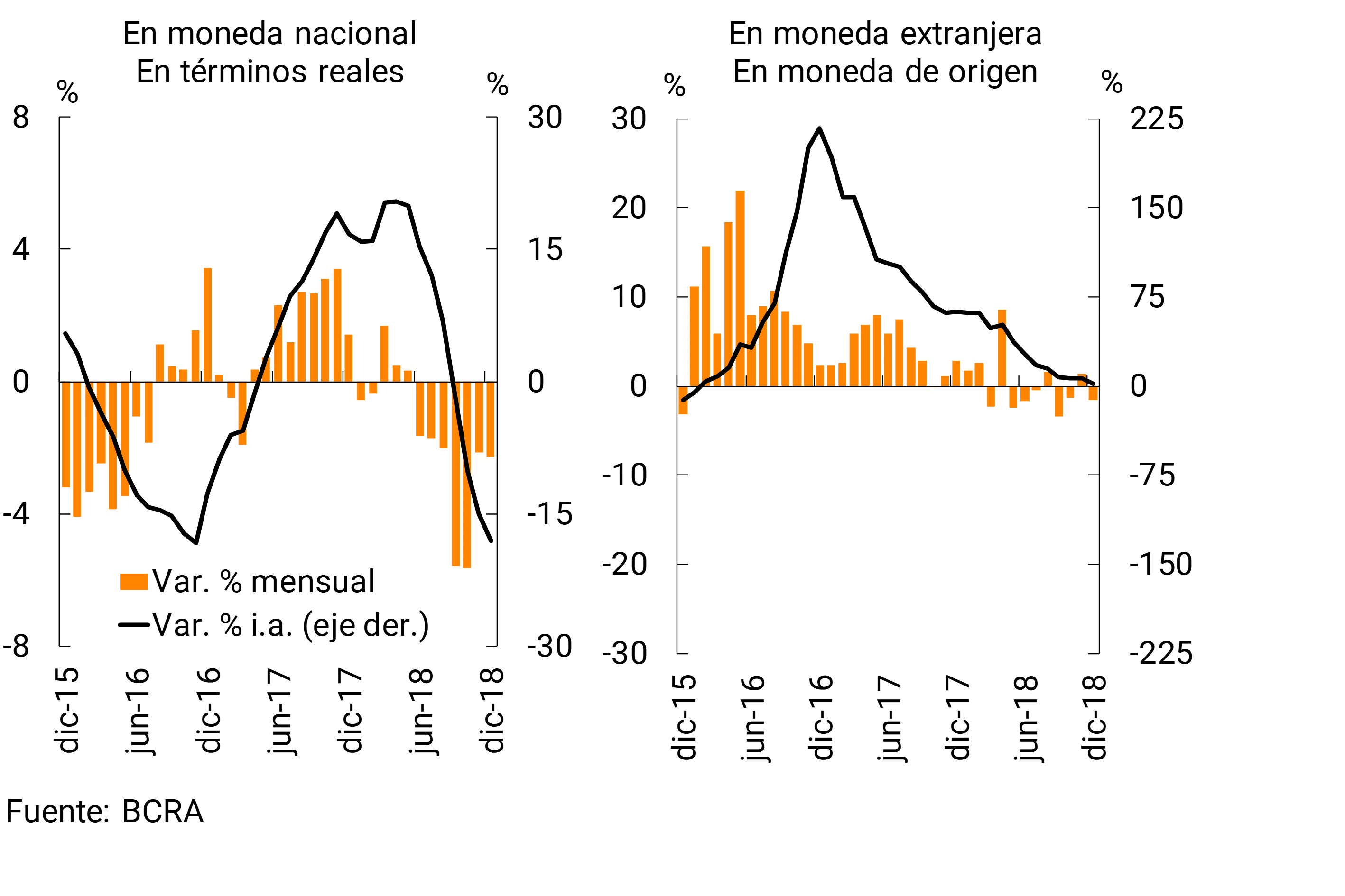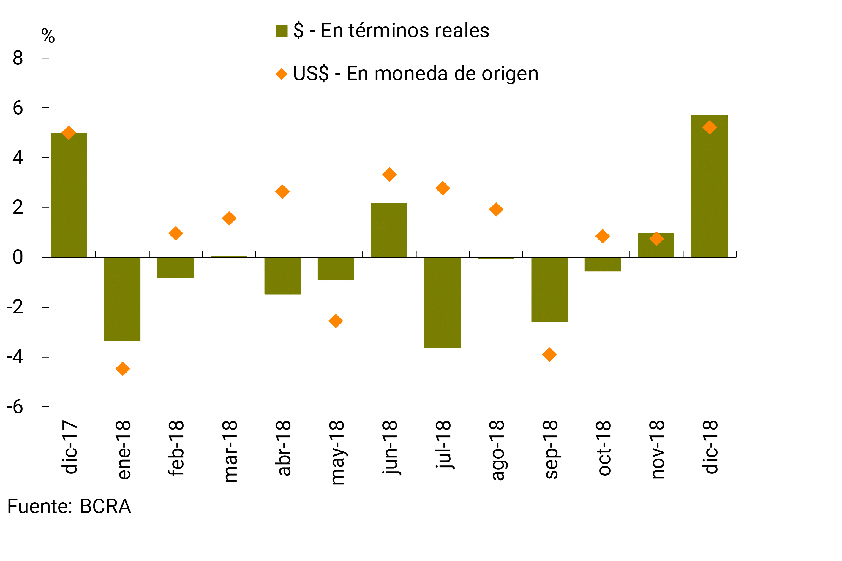 A lo largo de 2018 los depósitos del sector privado en pesos disminuyeron 4,8% real (-16,2% para las cuentas a la vista y +12,7% para las colocaciones a plazo, ambos valores en términos reales), en tanto que los efectuados por el sector público crecieron. Así, el saldo de depósitos totales en moneda nacional aumentó 2,5% real en los últimos doce meses. Por su parte, los depósitos en moneda extranjera acumularon un incremento de 8,2% —en moneda de origen— en 2018, con aumentos en las imposiciones del sector privado y del sector público (+8,9% y +4,9% respectivamente; ambos valores en moneda de origen).