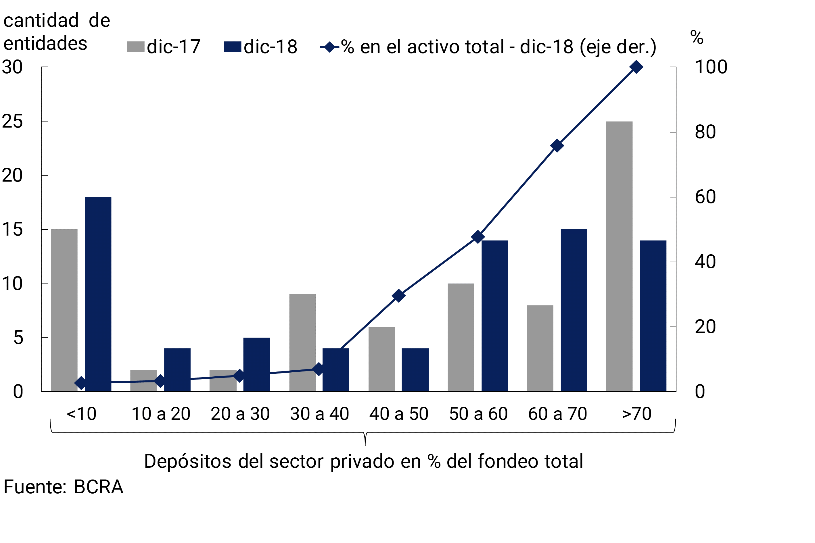 Teniendo en cuenta el desempeño de las distintas fuentes de recursos del sistema financiero, en diciembre la importancia relativa de los depósitos del sector privado en el fondeo total (pasivo y patrimonio neto) aumentó 2,8 p.p., hasta alcanzar un nivel de 57,5%. Como contrapartida, en el mes los depósitos del sector público redujeron 2,9 p.p. su participación en el fondeo total hasta ubicarse en 15,6%. A fines de 2018, un total de 43 bancos (de los 78 que integran el sistema financiero) tuvieron una relación entre depósitos del sector privado no financiero y fondeo total superior a 50% (estas entidades financieras representaron más de 70% del activo agregado, ver Gráfico 6).