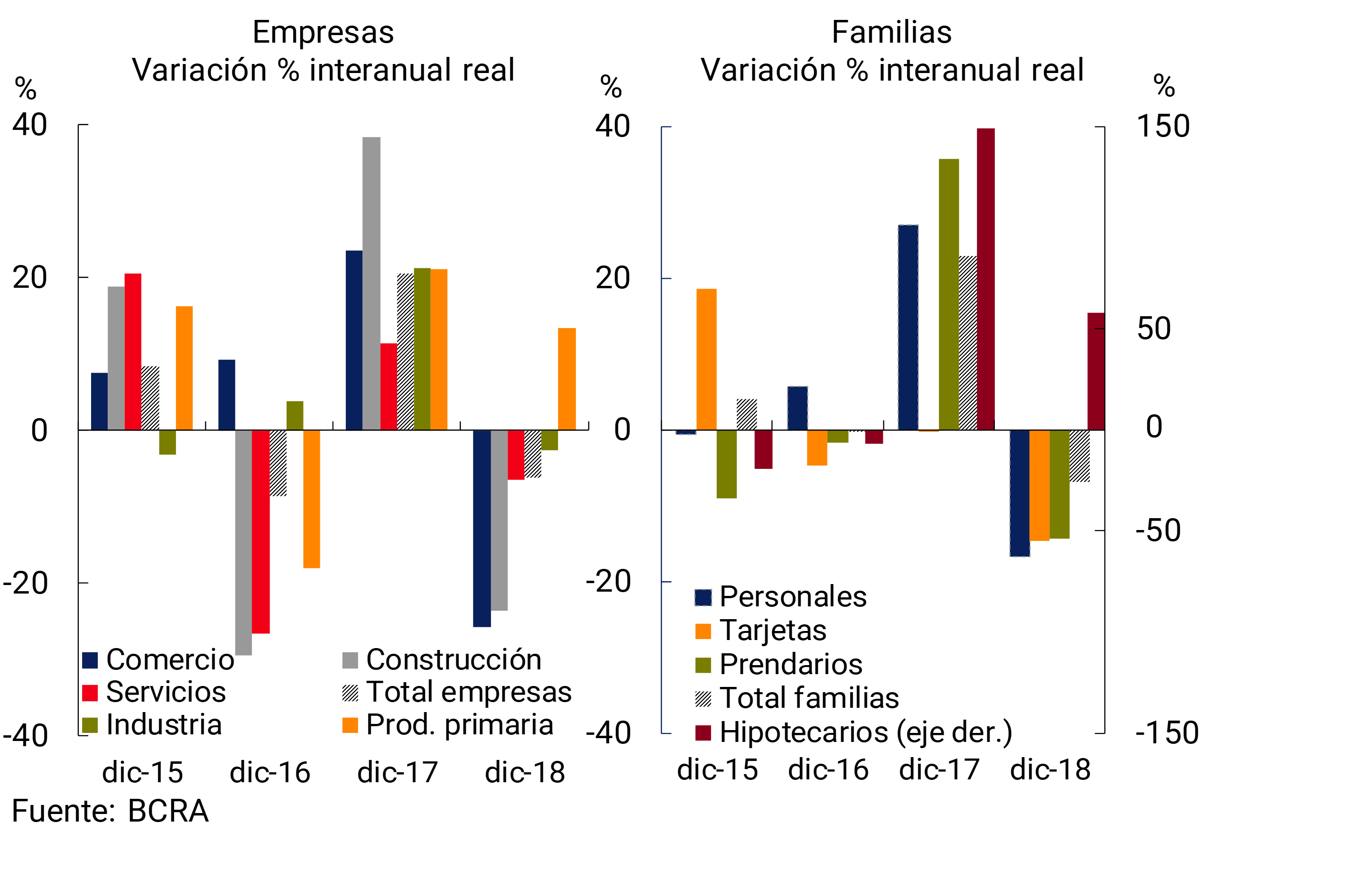 15 Información extraída de la Central de Deudores (comprende tanto moneda nacional como extranjera). No se incluyen los créditos a residentes en el exterior. Se consideran los ajustes de capital e intereses devengados. Las financiaciones a empresas se definen aquí como aquellas otorgadas a personas jurídicas y el financiamiento comercial otorgado a individuos. Por su parte, se considera préstamos a familias a aquellos otorgados a individuos, excepto que tengan destino comercial.
