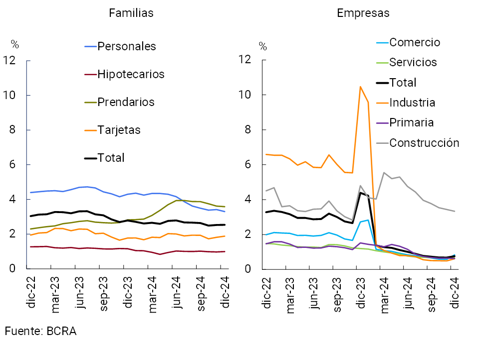 12 Si se considera el indicador de PDE basado en la cantidad de financiaciones, para el crédito al sector privado se ubicó en 2,1% al cierre del año, en 1,4% para empresas y en 2,1% para familias; todos estos indicadores se incrementaron levemente a lo largo del año.