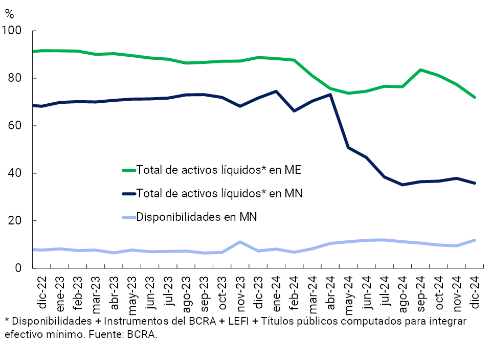 13 Considera disponibilidades (efectivo y cuenta corriente en el BCRA), letras fiscales de liquidez (LEFI), y el saldo de las especies de títulos públi-cos que las entidades computan como integración de Efectivo Mínimo (hasta el mes de mayo de 2024, también incorporaba instrumentos del BCRA).