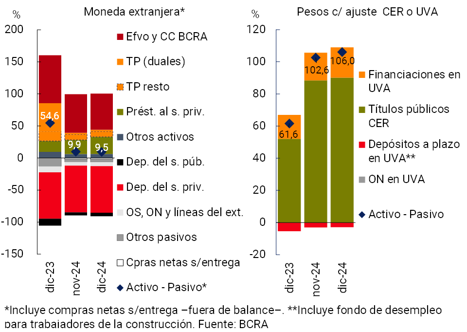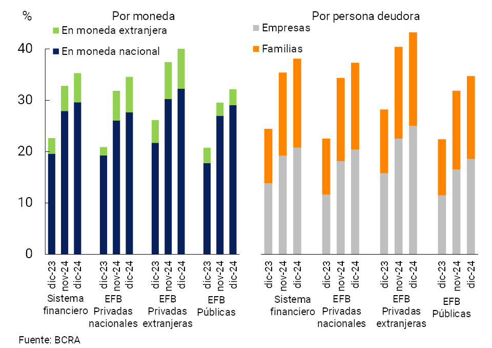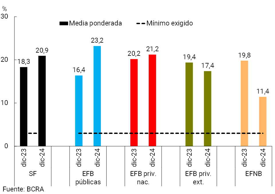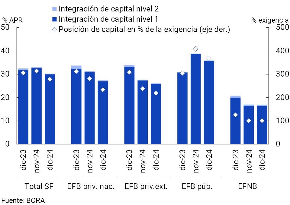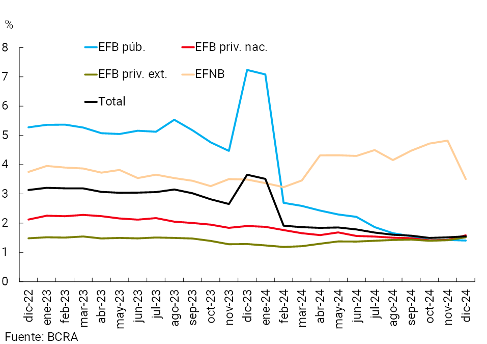 4 Al considerar grupos de entidades financieras (según origen de capital), las variaciones observadas en los saldos entre diciembre y noviembre de 2024 reflejan el efecto del avance en el proceso de adquisición de un banco extranjero por parte de un banco nacional. Para mayor detalle ver Comunicación “C” 99322 y Recuadro 4 del Informe de Estabilidad Financiera de Diciembre de 2024.