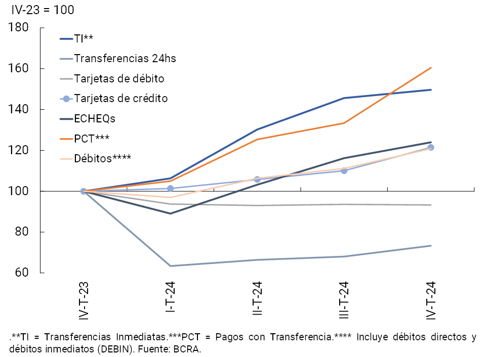 • A lo largo de 2024 los medios de pago electrónico continuaron expandiéndose, impulsados por las transferencias inmediatas que crecieron 48,7% i.a. en términos reales y 49,6% i.a. en cantidad de operaciones. También se destacó el aumento interanual en el uso de pagos con transferencias (+60,4% i.a. en cantidades) y de ECHEQs (+24% i.a. en cantidades).