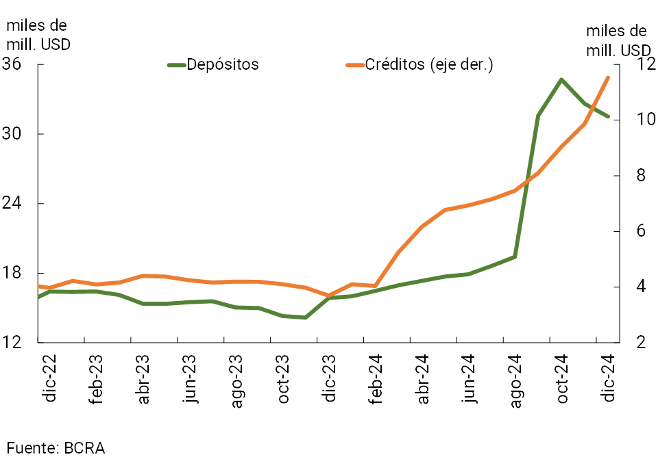 • En diciembre el saldo real de los depósitos en pesos del sector privado aumentó 4,9%. El desempeño mensual fue explicado principalmente por los depósitos a la vista, recogiendo el efecto estacional del cobro del medio aguinaldo. El saldo de depósitos en moneda extranjera del sector privado se redujo levemente en diciembre —en moneda de origen—, no obstante, alcanzó un nivel que casi duplica al registrado un año atrás —como reflejo del Régimen de Regularización de Activos—.