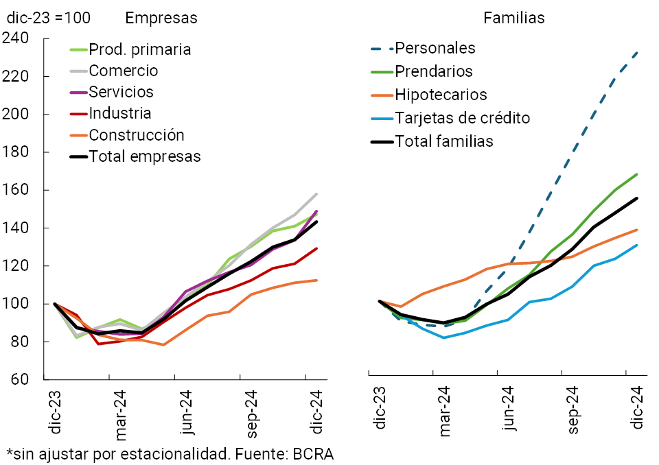 En este escenario, en el cierre de 2024 el saldo real de crédito total (incluyendo moneda nacional y extranjera) al sector privado aumentó 7,6% respecto a noviembre, con crecimientos tanto en el segmento de las empresas como de las familias (ver Gráfico 3)2. En una comparación interanual, el saldo de crédito total al sector privado acumuló un aumento de 54% en términos reales.