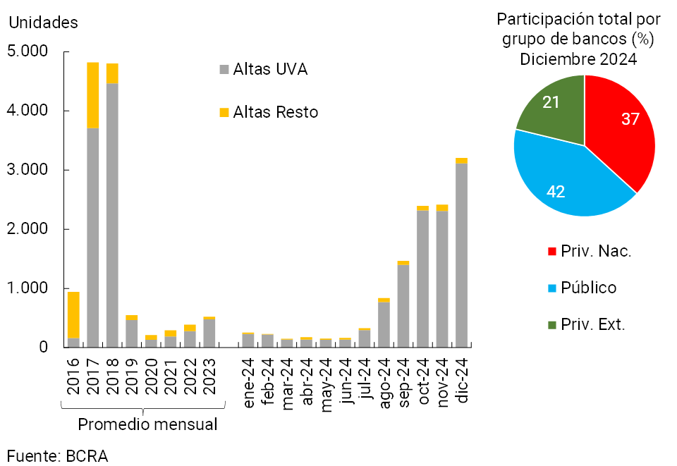 Desde niveles aún inferiores a los registrados en 2018 y 2019, el saldo real de crédito hipotecario recobró impulso en la segunda mitad de 2024, verificando un crecimiento de 3,7% real en el último mes del año y de 30,1% en una comparación interanual —incluyendo capital y ajuste de los préstamos en UVA—. Se estima que en diciembre el sistema financiero incorporó cerca de 3.200 nuevos deudores hipotecarios, operaciones que fueron pactadas en su mayoría en UVA (ver Gráfico 4).